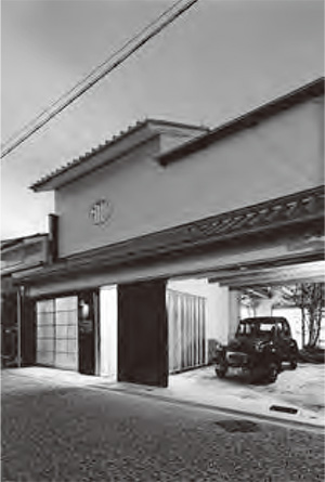大阪で唯一の重要伝統的建造物群保存地区に建てられた住宅。外観は町並みに合わせて、しっくい、杉板、虫籠窓を使用し、屋根勾配も周囲に合わせている。内部は昔ながらの通り土間形式を用いて、1階にビオトープのある中庭や茶庭を含め3箇所、2階にデッキテラス、屋上庭園と全部で5箇所の性格の異なる庭を設けて、それぞれ部屋と連絡させ、同時に風と光を呼び込んで居心地のよい住宅をつくりだしている。各部屋はけっして広くないが、中庭という外部空間を上手に使いこなしていくことによって所定の目的が達成されるように思う。新築の場合でもこのように伝統を担って、その香りを生み出すこともできる一例といえようか。