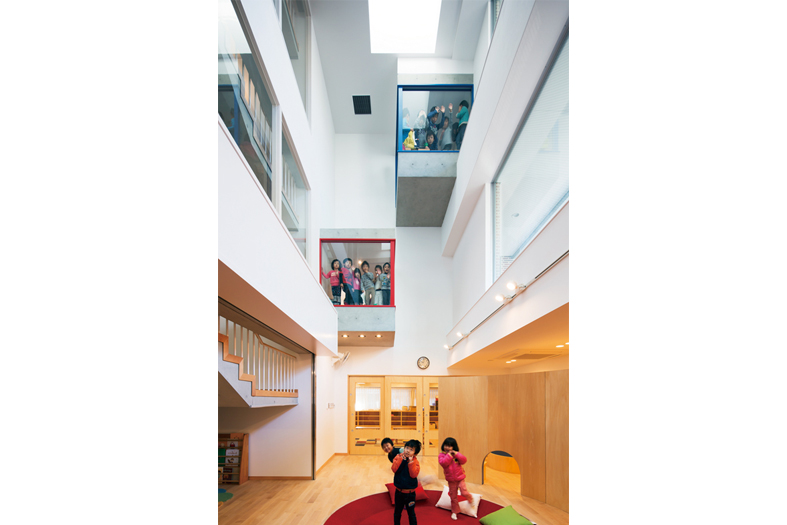 大阪の密集市街地に建つ四階建ての保育園。隣家とも接近せざるを得ない厳しい敷地の制約の中で、あえて建物を南側に寄せ、北の前面道路側に園庭を残すことで、隣地との干渉を避けています。北側の庭といっても、道路に接するために十分な開放感があり、逆に、安定した採光も得られていて効果的でした。また、屋内の二箇所の縦動線となる階段室を活かして、重層の避けられない保育室群を視覚的に有機的につなぐ試みが、功を奏しています。廊下や扉、開口部など、随所にきめ細かい配慮がなされ、コンペで選ばれた設計者が、引き続き同じ依頼主の別の施設の依頼をされていることにも、施主からの大きな信頼が得られていることが表れています。