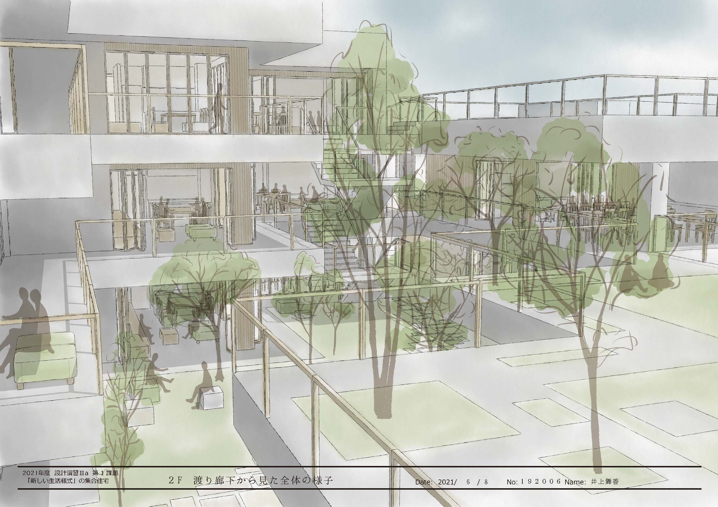 井上舞香さんの「土間から広がる食と生活」は、コロナ禍により自宅で過ごす時間が増え、昼食を家族と摂る機会が増えたことから着眼したという、住戸のダイニングとキッチンを集合住宅の住民相互の接点にしようという提案である。共用空間と連続する土間で仕上げられたダイニングとキッチンが、フルオープンのサッシで共用空間に接している。玄関扉を介して孤立した住戸が並ぶだけの無味乾燥な形式が繰り返し生産されるという、現代集合住宅における硬直した状況は、そこに具体的かつ現実的な空間的提案をすることがいかに難しいことかを物語っている。そこに挑んでくれたこと、しかも見事にコミュニケーションが活性化される豊かさを持つ集合住宅を描き出した点は高く評価したい。さらにそれ以外の個室空間や「ワークスペース」、「屋上菜園」などの共用空間をインタラクティブに関連付けられたなら、より提案の強度が増したと思う。