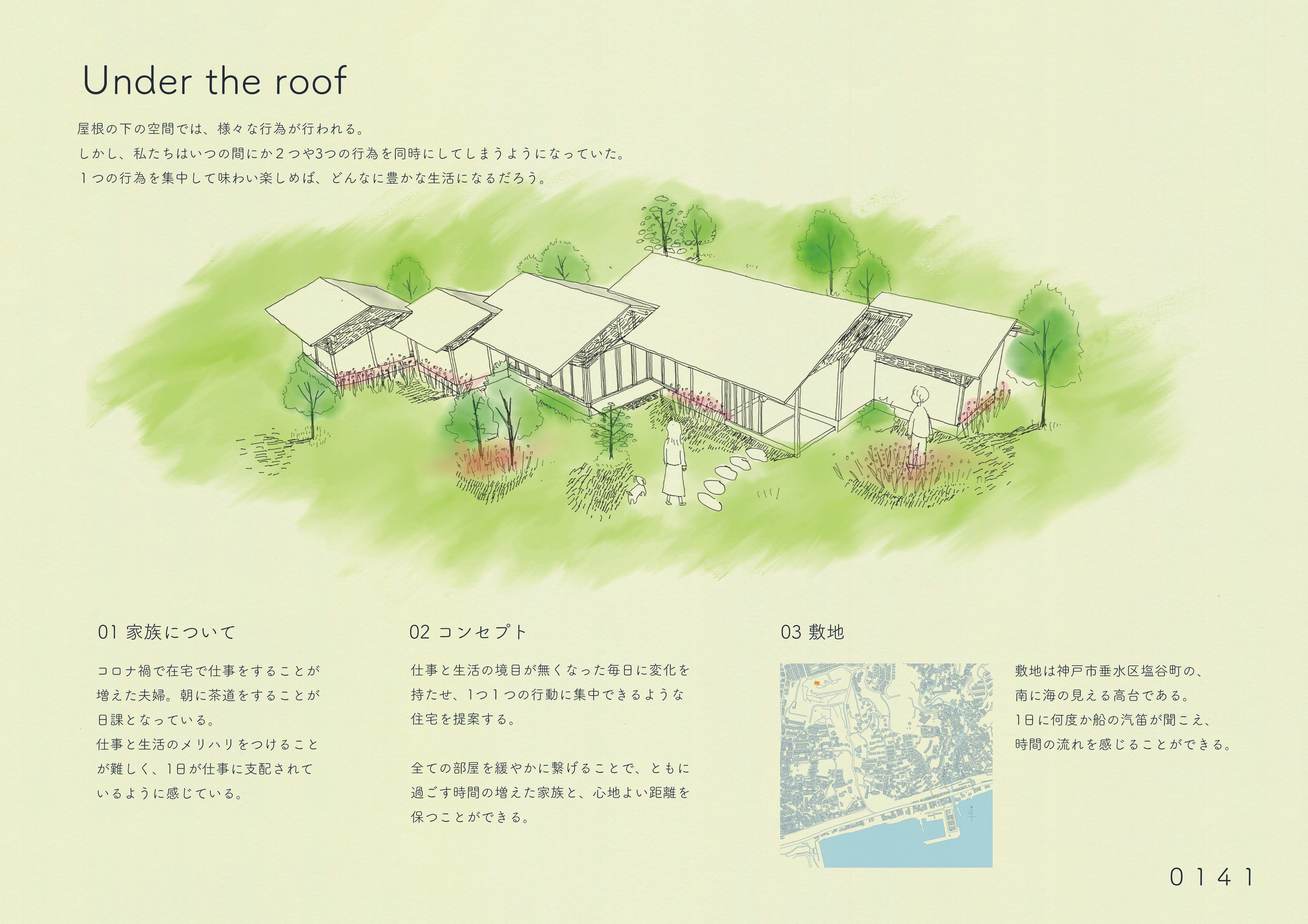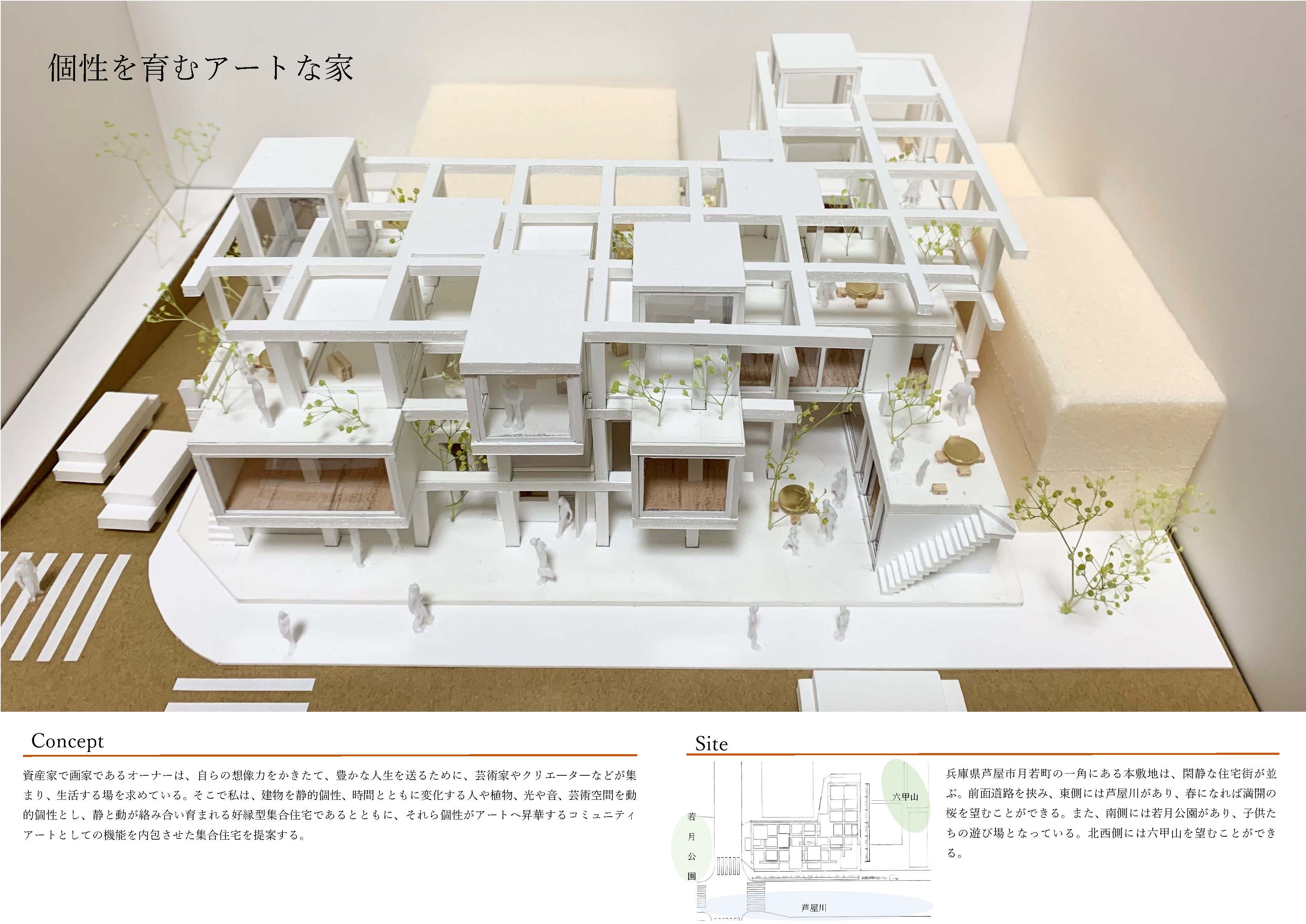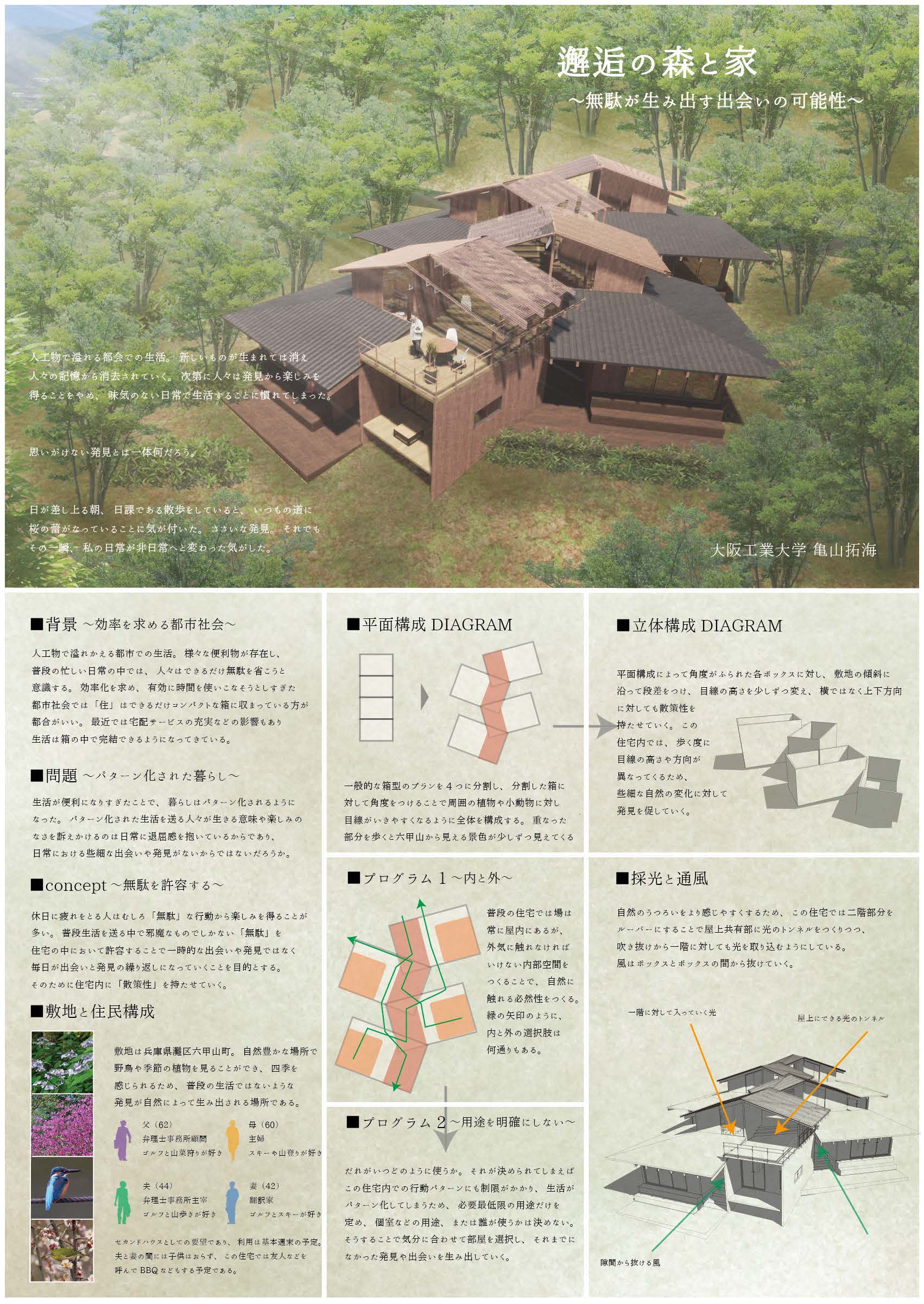 審査を終えて 河合哲夫竹中工務店 「家」を取り巻く様々な概念が激変している。夫婦と子供という「核家族世帯」は、50年前は大勢を占めていたが、現在は「単独世帯」がそれを上回っている。ジェンダーの概念も大きく変わり、血縁関係によらない「家族」も珍しくなくなった。こうした環境で建築を学び始めた若い世代が、どのような住宅像を描いてくれるのかを楽しみに審査をさせてもらった。 池田穂香さんの「NOOK」は、これを評価すべきか最後まで迷った作品である。いや、むしろ今でも迷っている。完成度は粗削りで決して高いとは言えない。それどころか建物の内外の境界さえ不確実である。設計の実務に携わるものにとっては苛立ちすら感じる。しかし彼女のプレゼンテーションと質疑応答からは、そうしたことは自覚した上で、それを受け容れてでも強度のある空間づくりを優先する一種の強さが伺えた。また、彼女が構想する空間的な仕掛けが生みだす行動や身体反応は、他のどの作品よりも多様でかつ具体的であった。建築とは、絶望的ともいえるほど現実的な存在である。彼女は、これからその現実的な課題に何度も直面することになるだろう。彼女の最優秀賞という評価には、もしかしたらそれを軽々と乗り越えてくれるのではないかという直感と期待が込められている。 森川明花さんの「移り行く家」は、増沢旬氏の「最小限住宅」と同じ3間×3間=9坪の平面を3分割して半階ずつずらしながら積み重ねる提案である。林間に設定された敷地の中で、窓から見える風景や外光の差し込み方、風の抜け方、気温などが場所ごとに異なるだろう。それも緩やかに微かに変化する=「移り行く」様が心地よい住空間を予感させる。肩の力を抜いて自然体の家づくりをしたように見せているが、多様で複雑に見える空間構成を単純な形式で生み出している技は優れている。 井上舞香さんの「土間から広がる食と生活」は、コロナ禍により自宅で過ごす時間が増え、昼食を家族と摂る機会が増えたことから着眼したという、住戸のダイニングとキッチンを集合住宅の住民相互の接点にしようという提案である。共用空間と連続する土間で仕上げられたダイニングとキッチンが、フルオープンのサッシで共用空間に接している。玄関扉を介して孤立した住戸が並ぶだけの無味乾燥な形式が繰り返し生産されるという、現代集合住宅における硬直した状況は、そこに具体的かつ現実的な空間的提案をすることがいかに難しいことかを物語っている。そこに挑んでくれたこと、しかも見事にコミュニケーションが活性化される豊かさを持つ集合住宅を描き出した点は高く評価したい。さらにそれ以外の個室空間や「ワークスペース」、「屋上菜園」などの共用空間をインタラクティブに関連付けられたなら、より提案の強度が増したと思う。 喜多村壮さんの「寄り会う人と人」は、「空室」と呼ぶ個室や各機能諸室をバラバラにして、それらを隣接する道路や河川とダイレクトに連続する外部空間でつなぐという、住宅全体を都市空間とシームレスに連続させてしまう提案である。ひとつの家を共有する「家族」の形式が拡大する現代において、この種の提案は現実味を持ちつつあるのかもしれない。同様の着眼点を持つ提案は他にも見られたが、彼の提案では芦原義信氏によるプロポーションの理論を引用しているだけあって、スケール感や造形力で一歩秀でるものがあった。 優秀賞には入らなかったが、上坂朋花さんの住戸の一部の機能を共用しあう集合住宅の提案、松川裕成さんによる1間モジュールのフレームだけを与えて、それを補助線として住民自らが空間をつくりながら生活する住宅の提案などは、可能性を感じるものがあった。 住まいを考えることとは、社会そのものから考えることだということを、再認識させてくれた審査であった。 平塚桂ぽむ企画 特別賞喜多村壮さんの「寄り会う人と人」は、大きな骨組みを軸に、多様な使い方を許容する、ゆるい空間をつくっている点に共感した。路地のモジュールを芦原義信の『街並みの美学』に求めながら、教条的な硬さがないのもよかった。「住宅」でありながら、固定的な用途や因習的な関係性に縛られず、また無理に開いて周囲とコミュニティを育もうという押し付けがましさも見られなかった。言葉選びも丁寧で良い。「コミュニティ」「つながり」といった近年の住宅設計界隈におけるバズワードを避け、「寄り会い」「気配」「関わり」といった言葉により、場に育まれる関係のあり方の固有性が表現されていた。部屋名を「寝室」等とせずに「空室」としている点も、居室に対し役割を固定しない配慮が感じられ、好ましく感じた。またメインパースがとても美しく、表現力の高さにもほれぼれした。 作品集 最優秀賞 作品テーマ NOOK 池田穂香 近畿大学 優秀賞 作品テーマ 移りゆく家 森川明花 神戸芸術工科大学 奨励賞 作品テーマ 土間から広がる食と