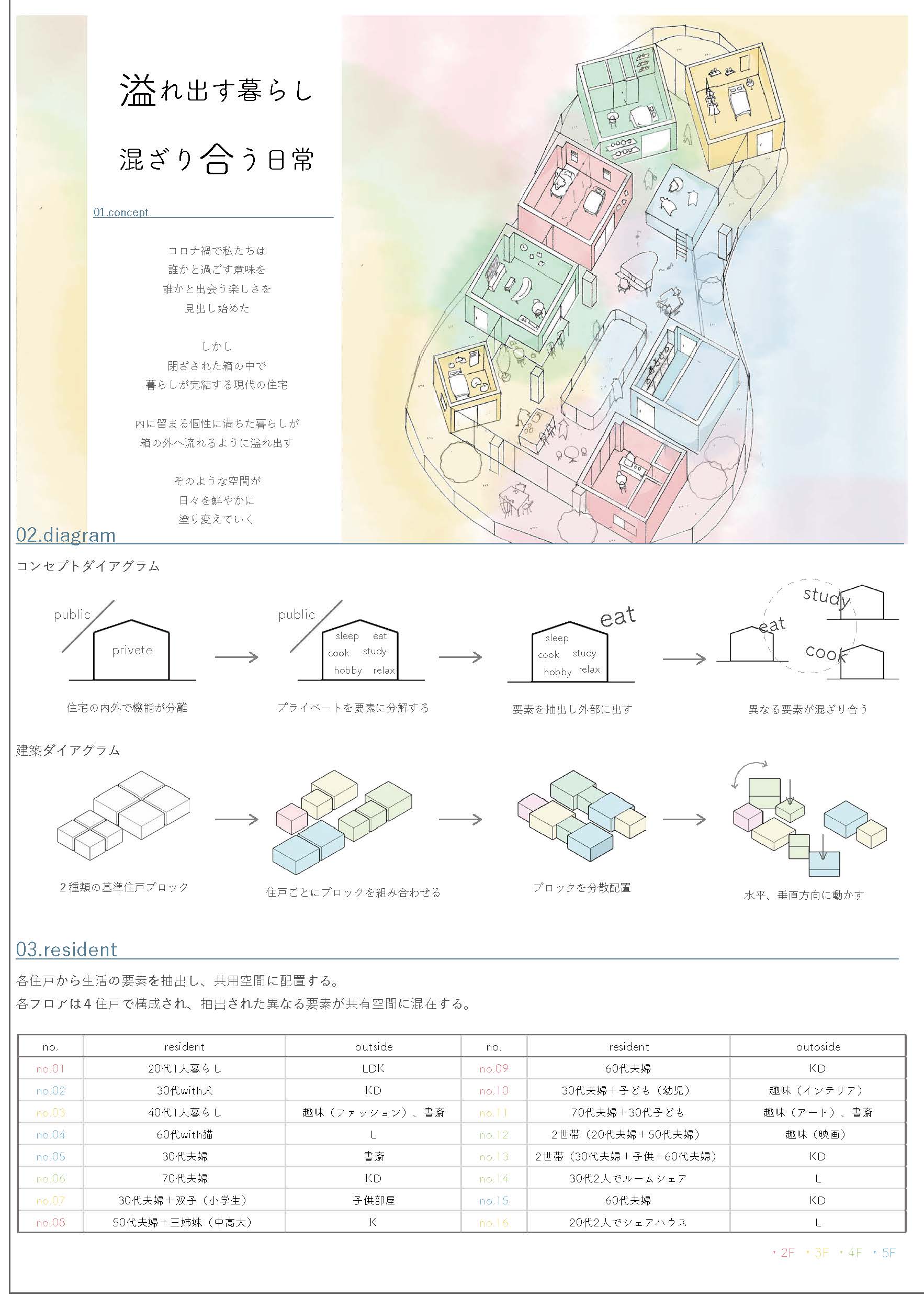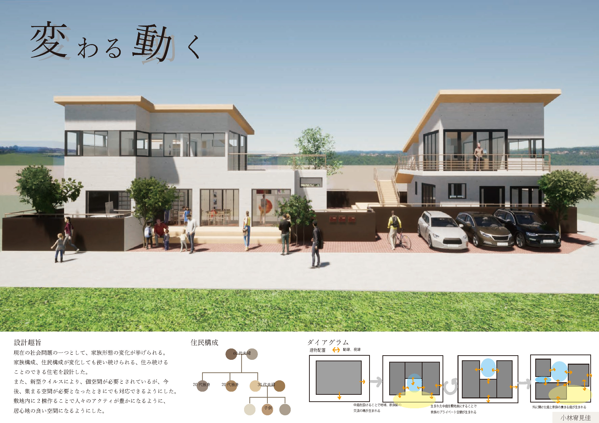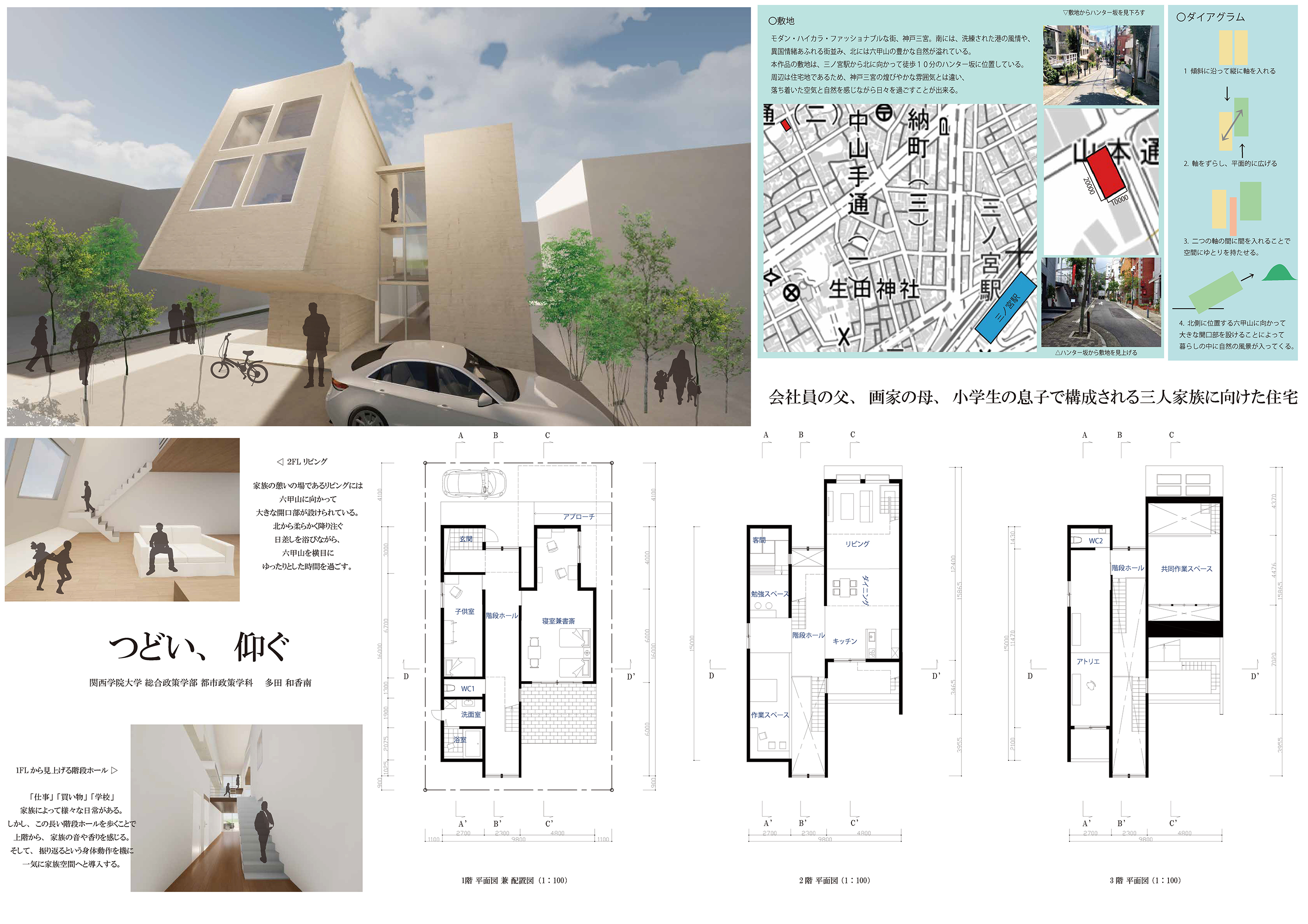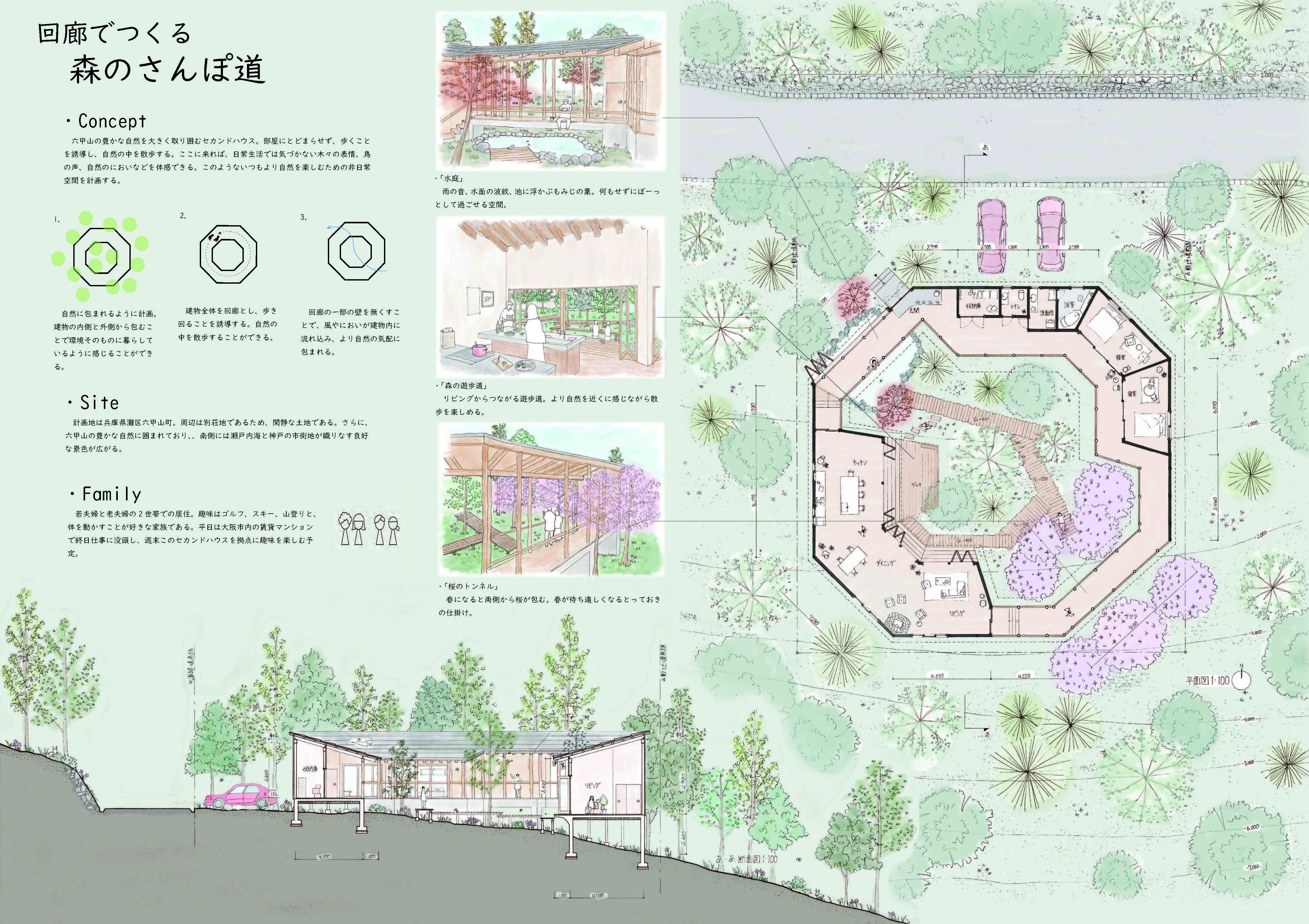 審査を終えて 河合哲夫竹中工務店 「家」を取り巻く様々な概念が激変している。夫婦と子供という「核家族世帯」は、50年前は大勢を占めていたが、現在は「単独世帯」がそれを上回っている。ジェンダーの概念も大きく変わり、血縁関係によらない「家族」も珍しくなくなった。こうした環境で建築を学び始めた若い世代が、どのような住宅像を描いてくれるのかを楽しみに審査をさせてもらった。 池田穂香さんの「NOOK」は、これを評価すべきか最後まで迷った作品である。いや、むしろ今でも迷っている。完成度は粗削りで決して高いとは言えない。それどころか建物の内外の境界さえ不確実である。設計の実務に携わるものにとっては苛立ちすら感じる。しかし彼女のプレゼンテーションと質疑応答からは、そうしたことは自覚した上で、それを受け容れてでも強度のある空間づくりを優先する一種の強さが伺えた。また、彼女が構想する空間的な仕掛けが生みだす行動や身体反応は、他のどの作品よりも多様でかつ具体的であった。建築とは、絶望的ともいえるほど現実的な存在である。彼女は、これからその現実的な課題に何度も直面することになるだろう。彼女の最優秀賞という評価には、もしかしたらそれを軽々と乗り越えてくれるのではないかという直感と期待が込められている。 森川明花さんの「移り行く家」は、増沢旬氏の「最小限住宅」と同じ3間×3間=9坪の平面を3分割して半階ずつずらしながら積み重ねる提案である。林間に設定された敷地の中で、窓から見える風景や外光の差し込み方、風の抜け方、気温などが場所ごとに異なるだろう。それも緩やかに微かに変化する=「移り行く」様が心地よい住空間を予感させる。肩の力を抜いて自然体の家づくりをしたように見せているが、多様で複雑に見える空間構成を単純な形式で生み出している技は優れている。 井上舞香さんの「土間から広がる食と生活」は、コロナ禍により自宅で過ごす時間が増え、昼食を家族と摂る機会が増えたことから着眼したという、住戸のダイニングとキッチンを集合住宅の住民相互の接点にしようという提案である。共用空間と連続する土間で仕上げられたダイニングとキッチンが、フルオープンのサッシで共用空間に接している。玄関扉を介して孤立した住戸が並ぶだけの無味乾燥な形式が繰り返し生産されるという、現代集合住宅における硬直した状況は、そこに具体的かつ現実的な空間的提案をすることがいかに難しいことかを物語っている。そこに挑んでくれたこと、しかも見事にコミュニケーションが活性化される豊かさを持つ集合住宅を描き出した点は高く評価したい。さらにそれ以外の個室空間や「ワークスペース」、「屋上菜園」などの共用空間をインタラクティブに関連付けられたなら、より提案の強度が増したと思う。 喜多村壮さんの「寄り会う人と人」は、「空室」と呼ぶ個室や各機能諸室をバラバラにして、それらを隣接する道路や河川とダイレクトに連続する外部空間でつなぐという、住宅全体を都市空間とシームレスに連続させてしまう提案である。ひとつの家を共有する「家族」の形式が拡大する現代において、この種の提案は現実味を持ちつつあるのかもしれない。同様の着眼点を持つ提案は他にも見られたが、彼の提案では芦原義信氏によるプロポーションの理論を引用しているだけあって、スケール感や造形力で一歩秀でるものがあった。 優秀賞には入らなかったが、上坂朋花さんの住戸の一部の機能を共用しあう集合住宅の提案、松川裕成さんによる1間モジュールのフレームだけを与えて、それを補助線として住民自らが空間をつくりながら生活する住宅の提案などは、可能性を感じるものがあった。 住まいを考えることとは、社会そのものから考えることだということを、再認識させてくれた審査であった。 平塚桂ぽむ企画 特別賞喜多村壮さんの「寄り会う人と人」は、大きな骨組みを軸に、多様な使い方を許容する、ゆるい空間をつくっている点に共感した。路地のモジュールを芦原義信の『街並みの美学』に求めながら、教条的な硬さがないのもよかった。「住宅」でありながら、固定的な用途や因習的な関係性に縛られず、また無理に開いて周囲とコミュニティを育もうという押し付けがましさも見られなかった。言葉選びも丁寧で良い。「コミュニティ」「つながり」といった近年の住宅設計界隈におけるバズワードを避け、「寄り会い」「気配」「関わり」といった言葉により、場に育まれる関係のあり方の固有性が表現されていた。部屋名を「寝室」等とせずに「空室」としている点も、居室に対し役割を固定しない配慮が感じられ、好ましく感じた。またメインパースがとても美しく、表現力の高さにもほれぼれした。 作品集 最優秀賞 作品テーマ NOOK 池田穂香 近畿大学 優秀賞 作品テーマ 移りゆく家 森川明花 神戸芸術工科大学 奨励賞 作品テーマ 土間から広がる食と