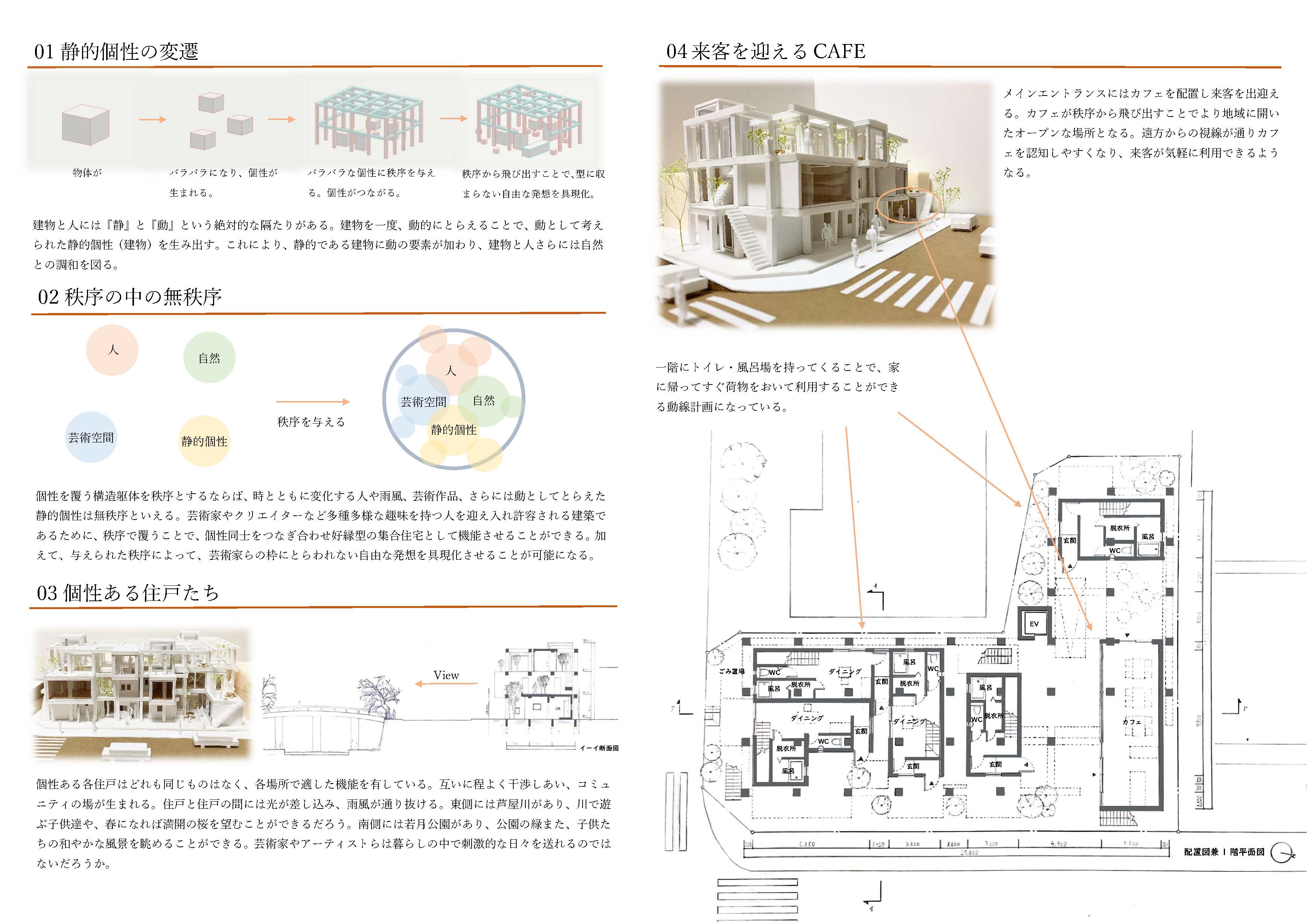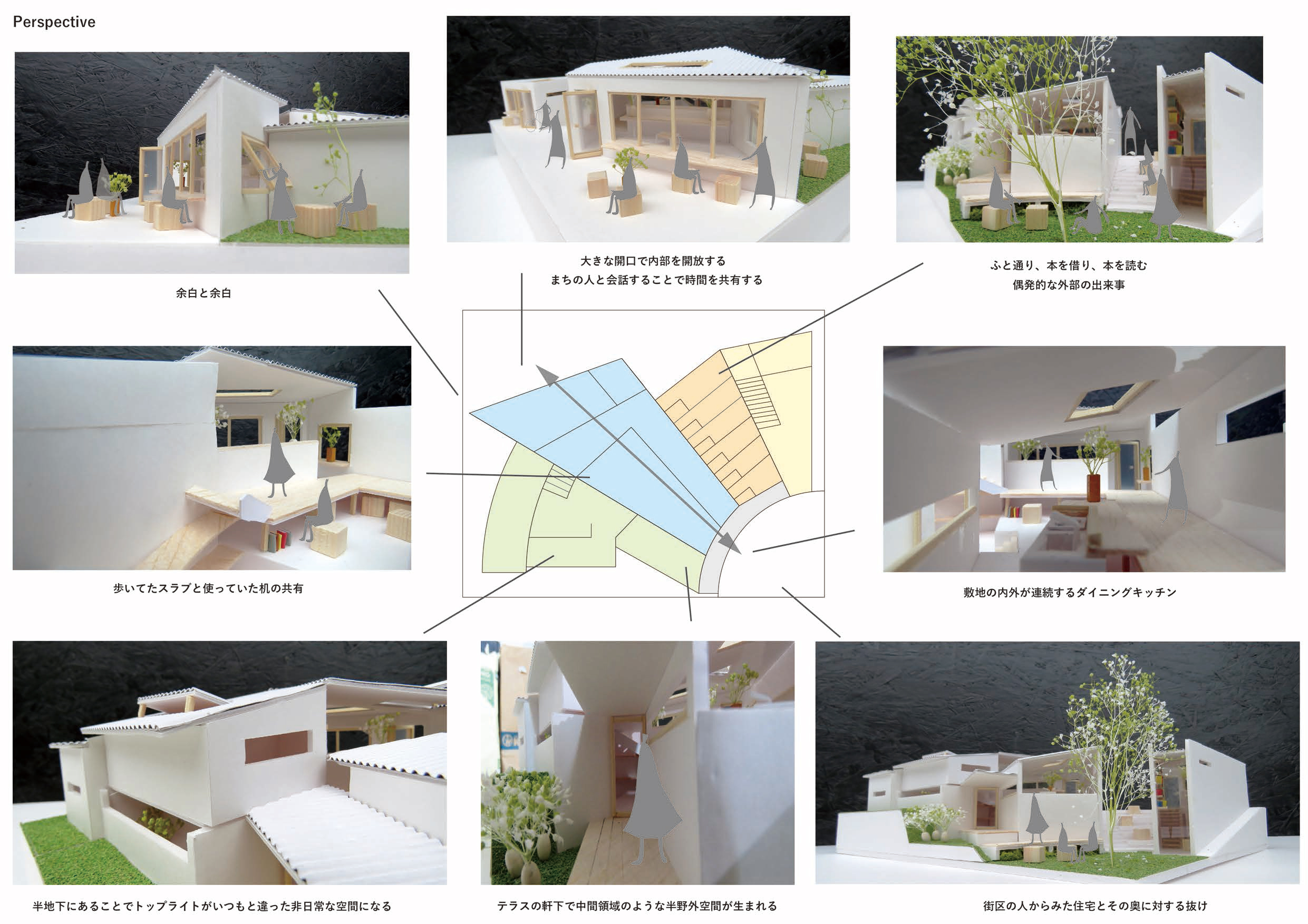 喜多村壮さんの「寄り会う人と人」は、「空室」と呼ぶ個室や各機能諸室をバラバラにして、それらを隣接する道路や河川とダイレクトに連続する外部空間でつなぐという、住宅全体を都市空間とシームレスに連続させてしまう提案である。ひとつの家を共有する「家族」の形式が拡大する現代において、この種の提案は現実味を持ちつつあるのかもしれない。同様の着眼点を持つ提案は他にも見られたが、彼の提案では芦原義信氏によるプロポーションの理論を引用しているだけあって、スケール感や造形力で一歩秀でるものがあった。