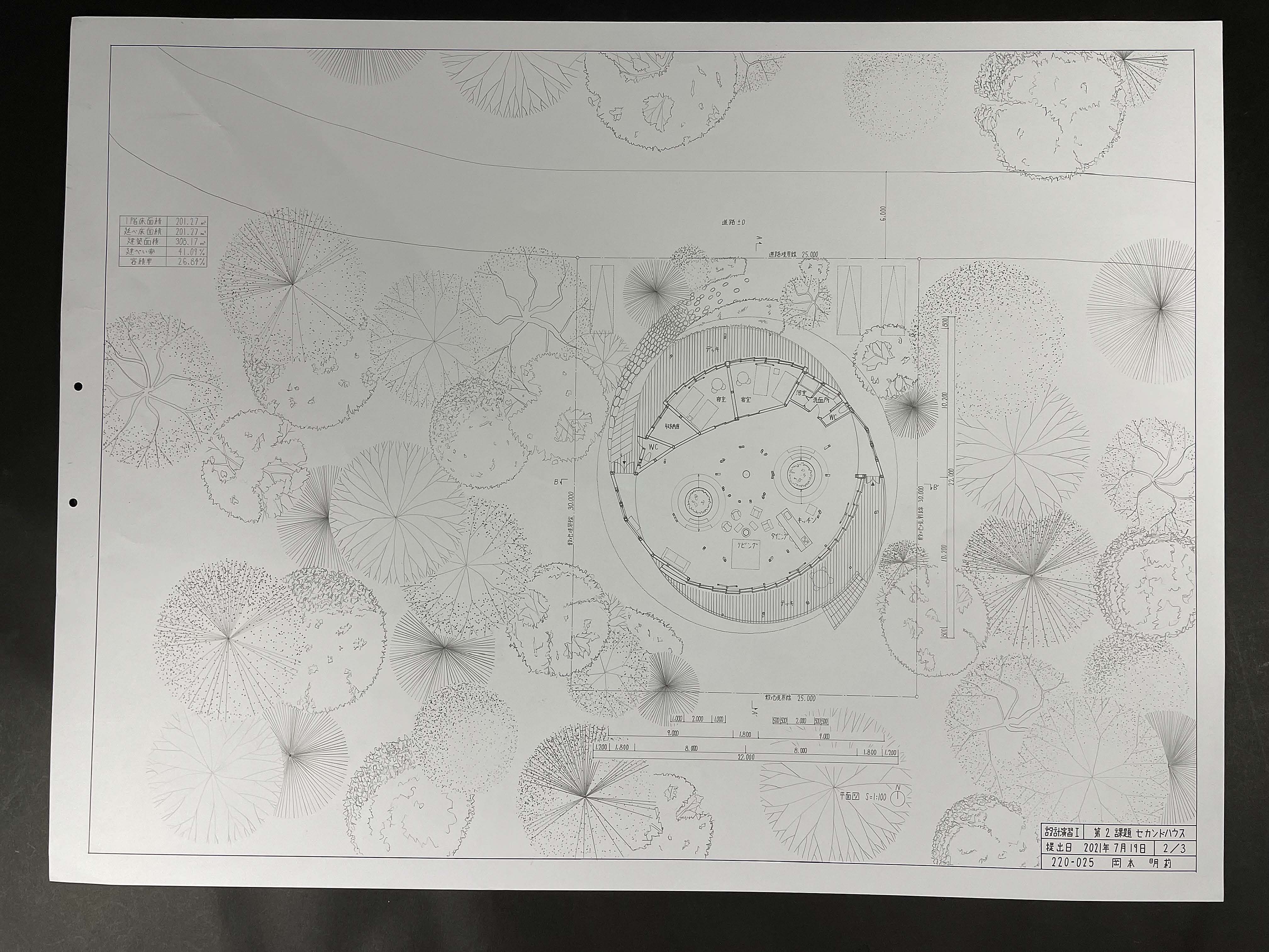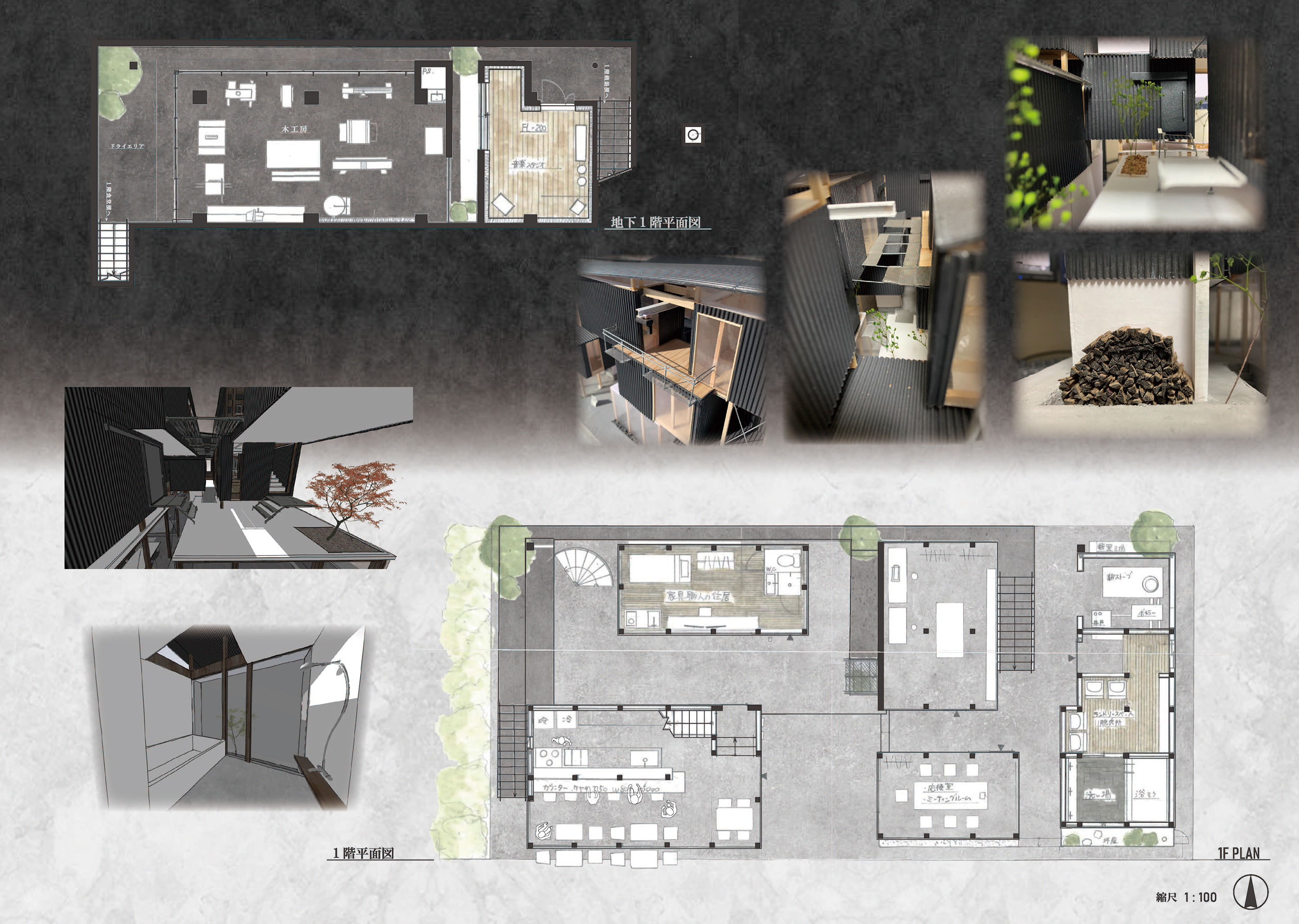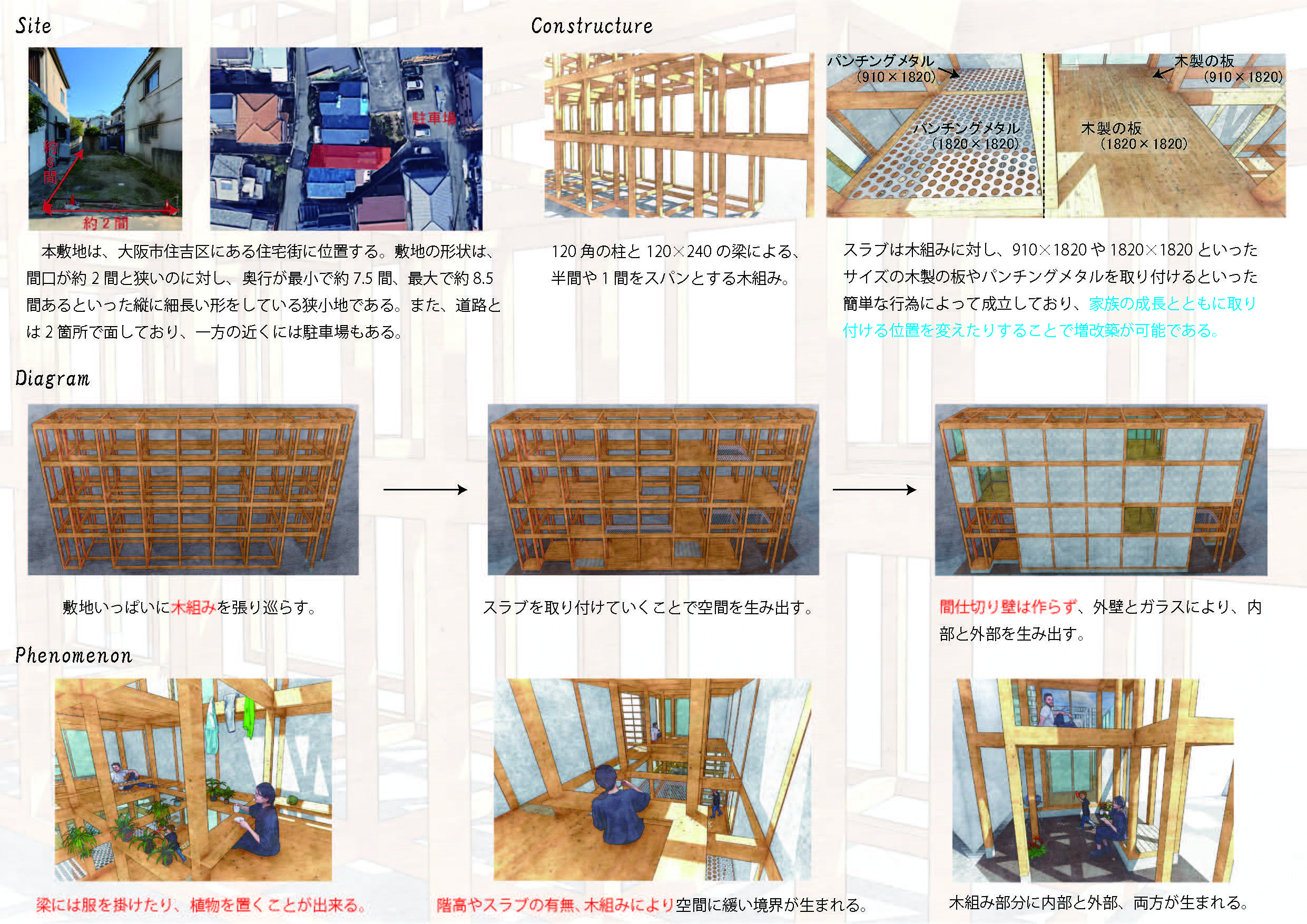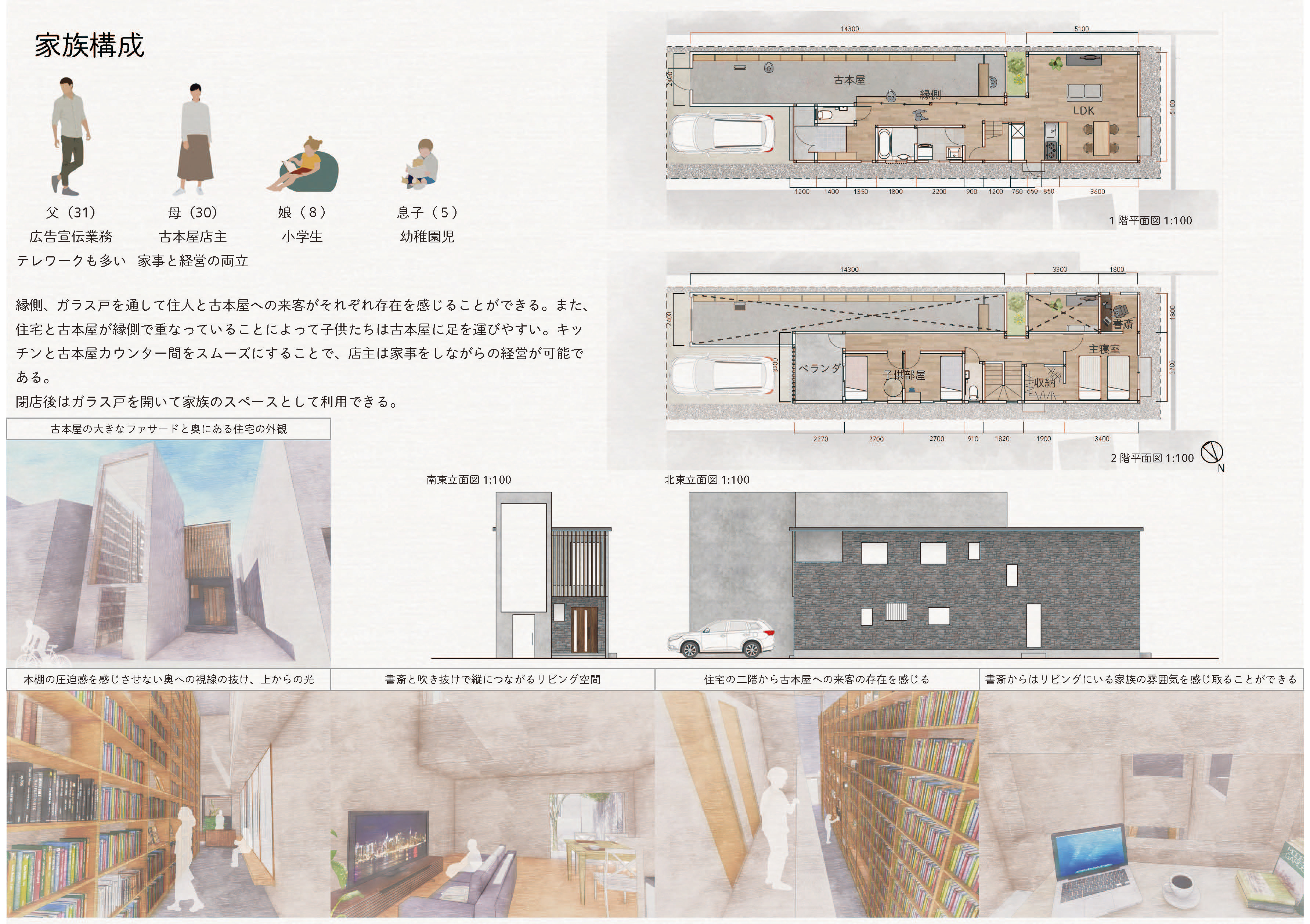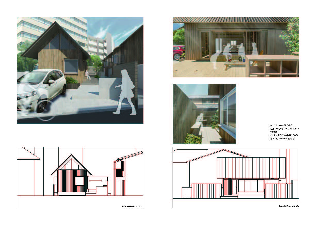特別賞喜多村壮さんの「寄り会う人と人」は、大きな骨組みを軸に、多様な使い方を許容する、ゆるい空間をつくっている点に共感した。路地のモジュールを芦原義信の『街並みの美学』に求めながら、教条的な硬さがないのもよかった。「住宅」でありながら、固定的な用途や因習的な関係性に縛られず、また無理に開いて周囲とコミュニティを育もうという押し付けがましさも見られなかった。言葉選びも丁寧で良い。「コミュニティ」「つながり」といった近年の住宅設計界隈におけるバズワードを避け、「寄り会い」「気配」「関わり」といった言葉により、場に育まれる関係のあり方の固有性が表現されていた。部屋名を「寝室」等とせずに「空室」としている点も、居室に対し役割を固定しない配慮が感じられ、好ましく感じた。またメインパースがとても美しく、表現力の高さにもほれぼれした。