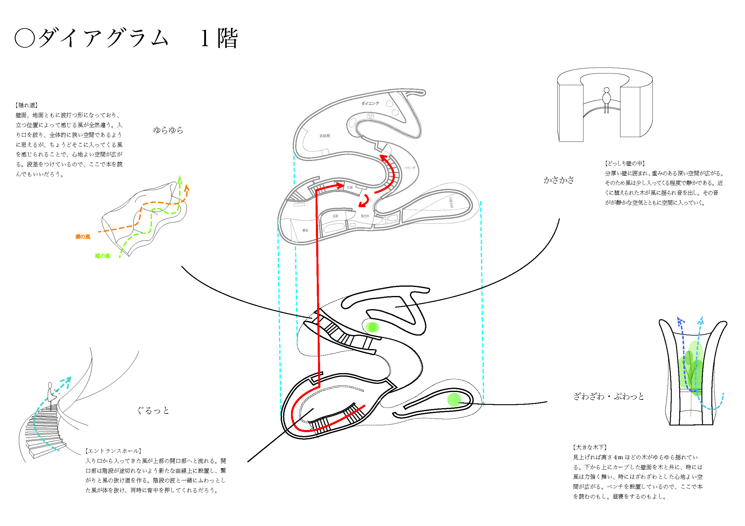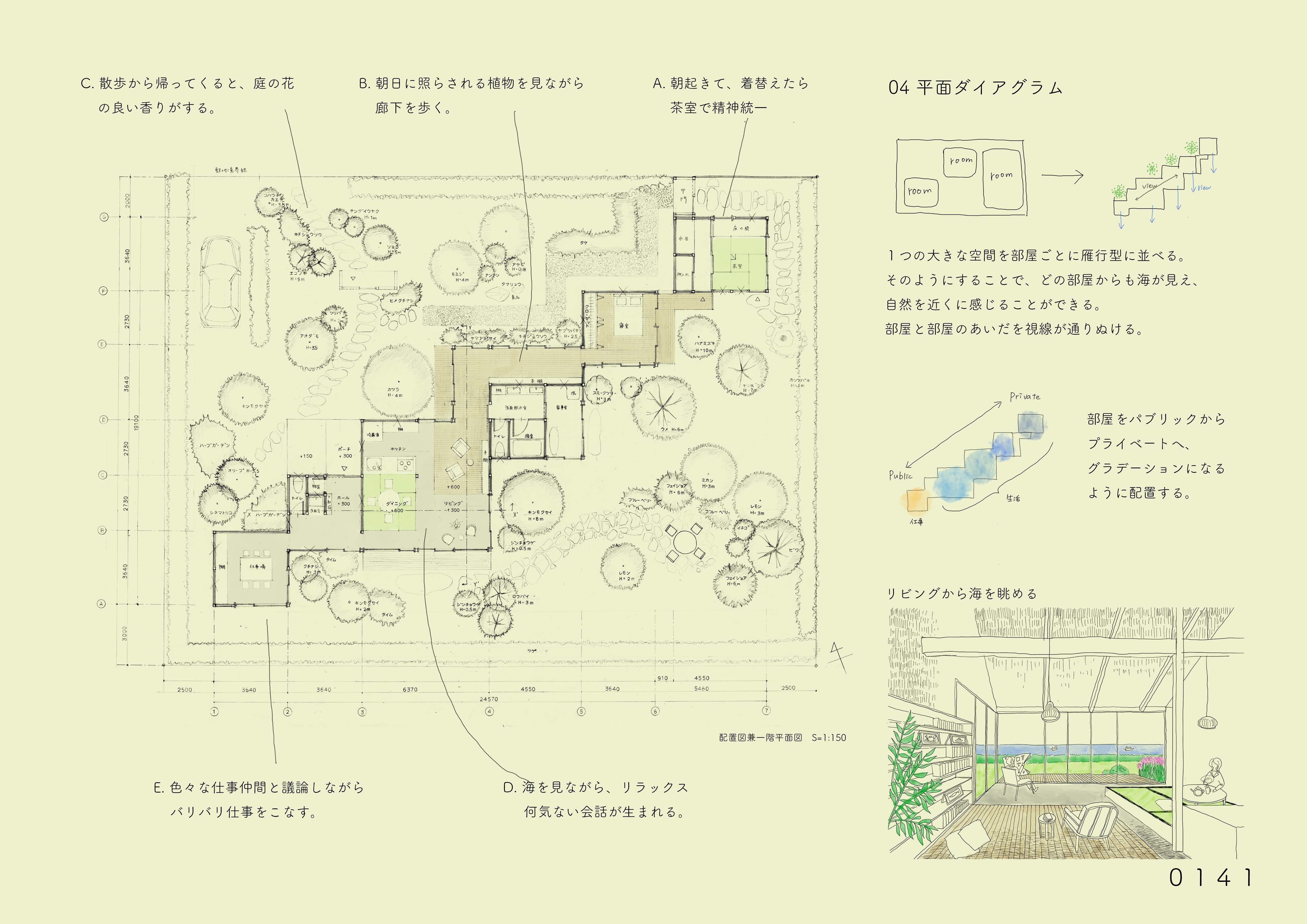 森川明花さんの「移り行く家」は、増沢旬氏の「最小限住宅」と同じ3間×3間=9坪の平面を3分割して半階ずつずらしながら積み重ねる提案である。林間に設定された敷地の中で、窓から見える風景や外光の差し込み方、風の抜け方、気温などが場所ごとに異なるだろう。それも緩やかに微かに変化する=「移り行く」様が心地よい住空間を予感させる。肩の力を抜いて自然体の家づくりをしたように見せているが、多様で複雑に見える空間構成を単純な形式で生み出している技は優れている。