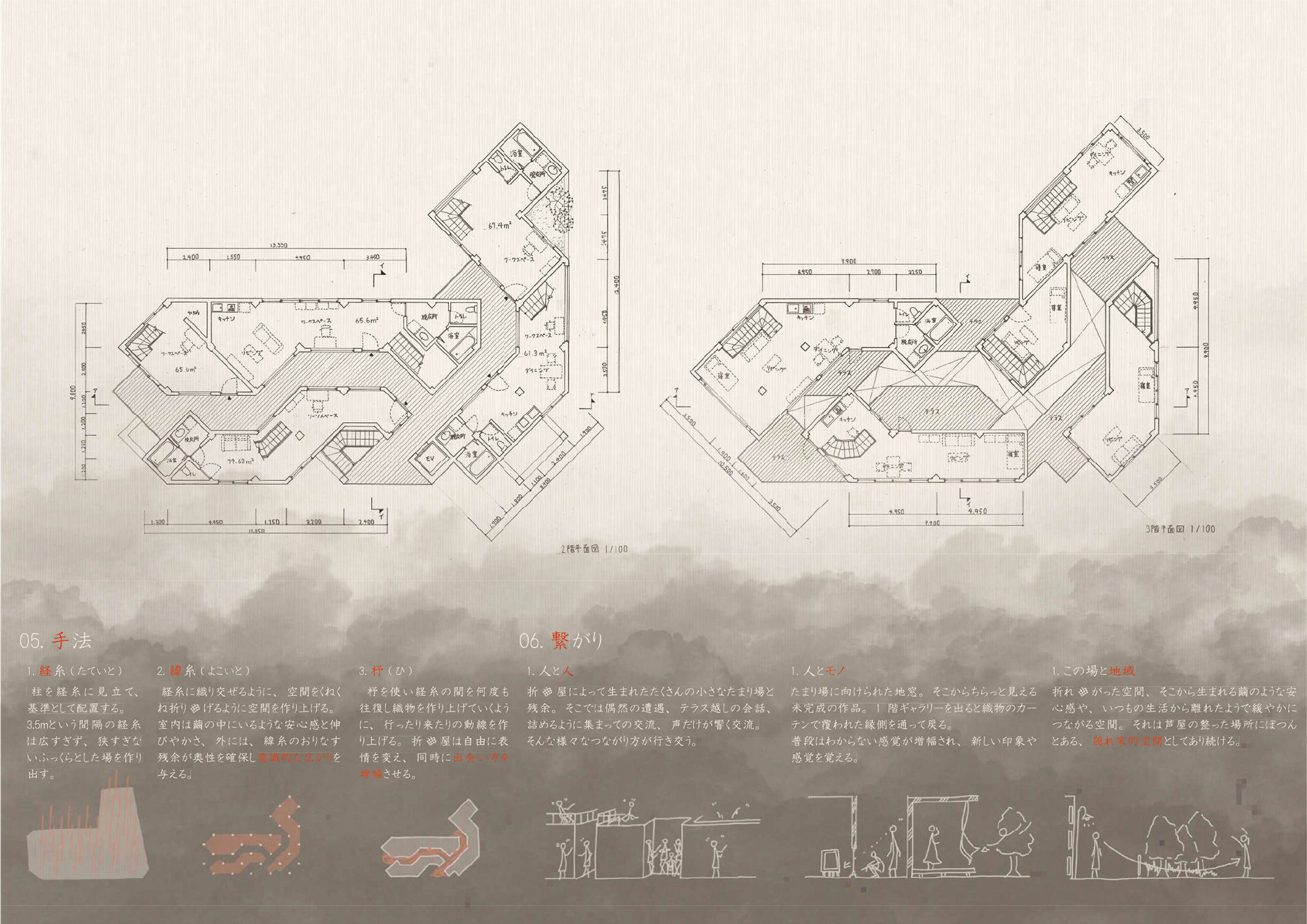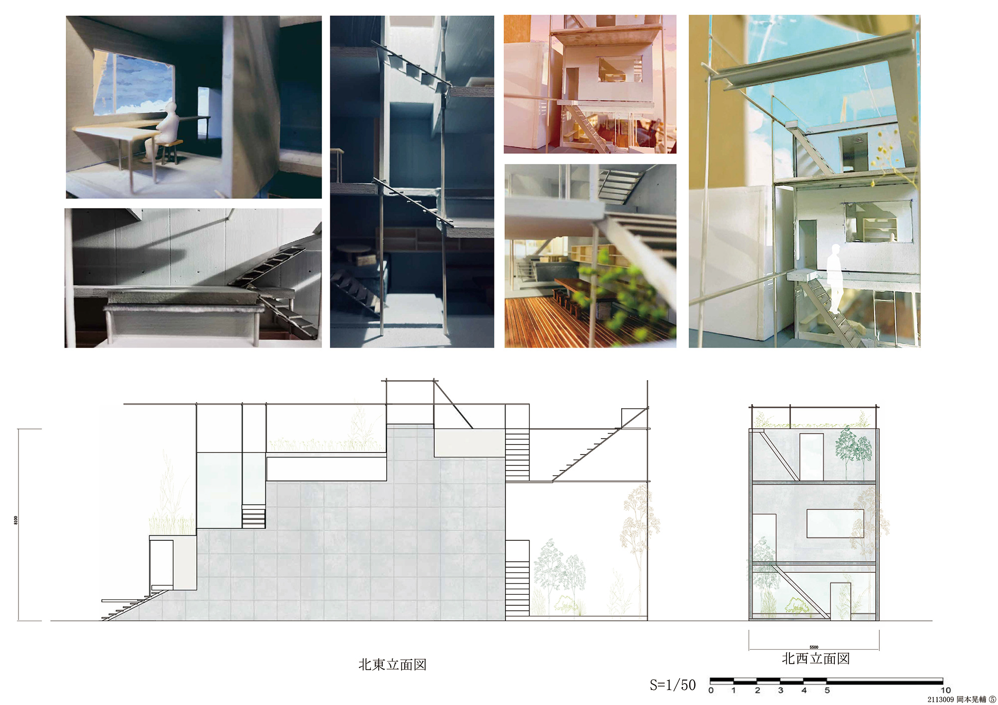 もうひとつの優秀賞に選ばれた上野祐花さんによる「ミチクサの家」は、古本屋を営む夫婦のための住宅と店舗の提案である。不規則に配置された壁で分けられた双方の機能は、平面的にも断面的にも複雑に絡み合っている。私的な生活と古本屋という職業と、ここを訪れる来客たちと、それら相互を明確な境界で隔てることなく暮らしていきたいと願うクライアントの気持ちが伝わってくるようだ。図面表現の細部においては、実務者としては気になる部分が散見されたが、それらまでもが独特な「緩さ」とでもいうような空気感を与えていて、そんなことを気にするこちらが野暮なのかとまで思わされて悔しい。この自由さを失うことなく、それでも信頼される技術者としての成長を期待したい。