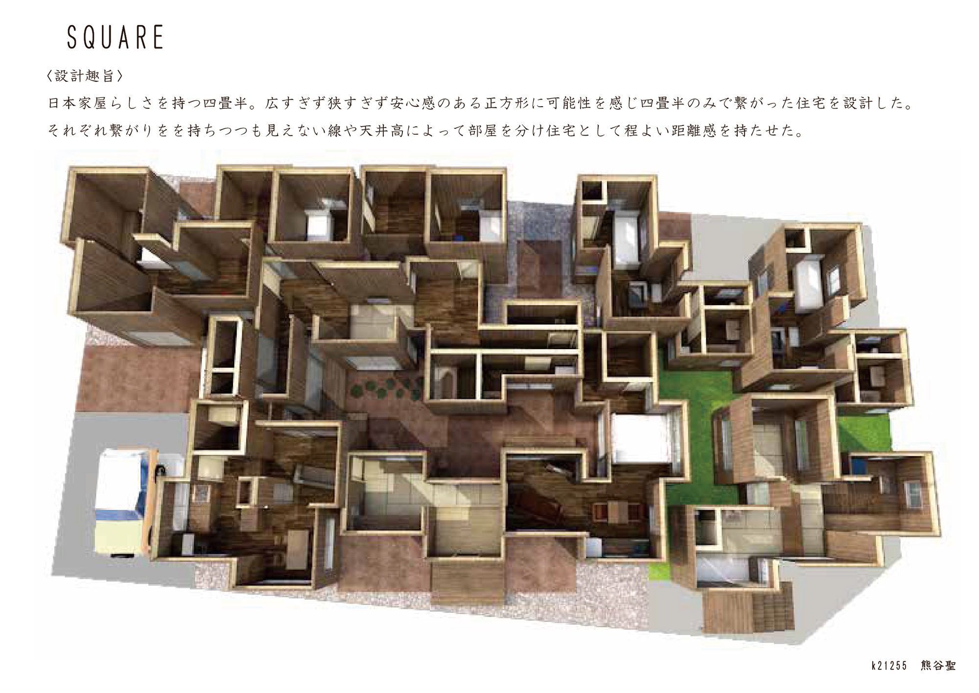 その他、熊谷聖さんの「square」における、四畳半に限定したボリュームを繋げて住宅をつくるという空間構成のアイデア、LGBTsという今日的課題に挑んだ大坪橘平さんの「病めるときも、健やかなるときも」におけるプランニングのロジック(完全には理解できなったが惹かれるプレゼンテーションであった)など、興味深い提案が見られた。総じて何らかの点で「コミュニケーション」という課題に対してはたらきかける作品が大半であった。