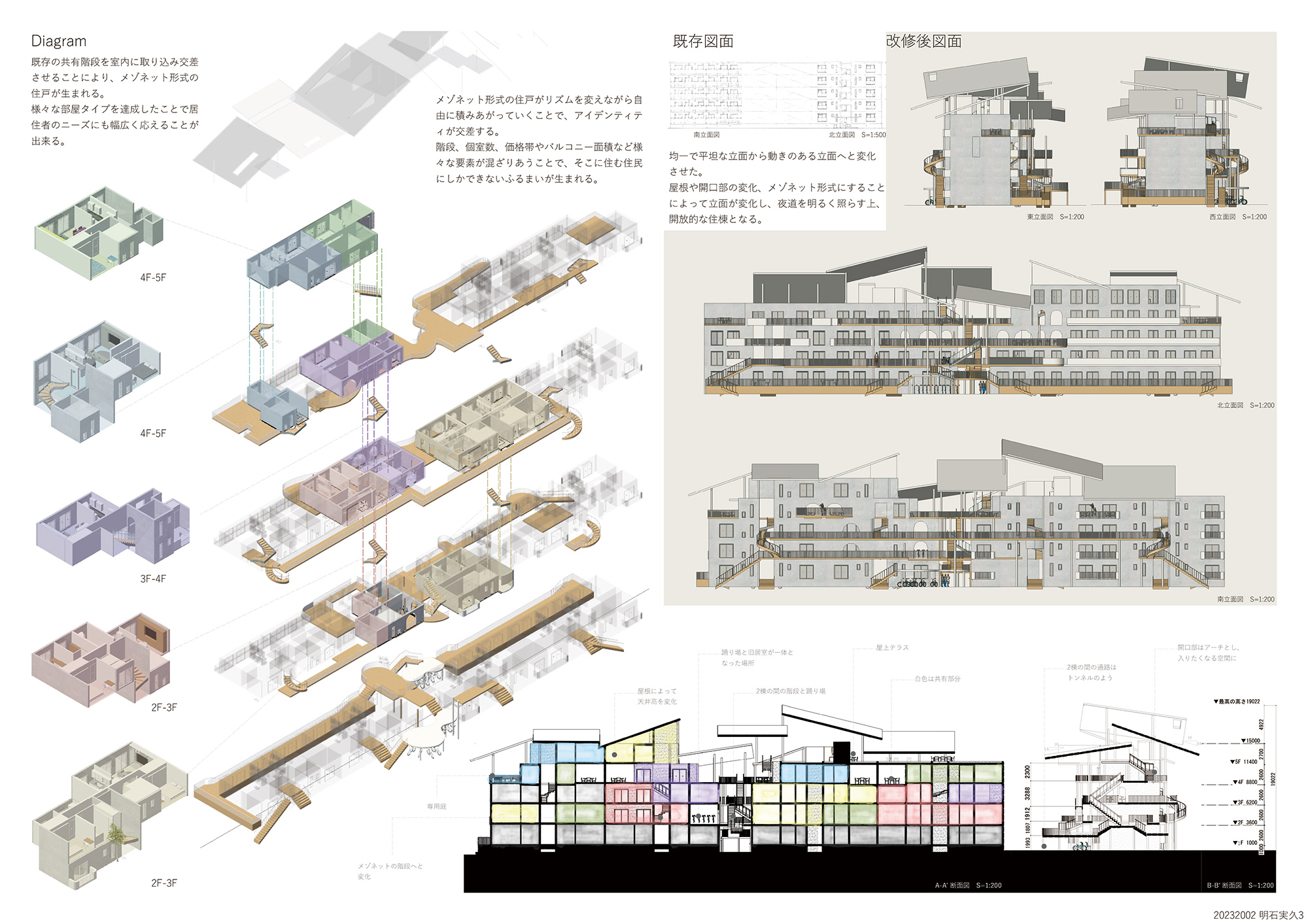 審査を終えて 河合哲夫 就寝や食事をはじめ、ひとの行動の中で住宅において行われないものはほとんどない。人生を通して住宅を体験しない人はほぼいない。いまさら言うまでもなく、世帯は社会の最も基本となる要素であり、住宅に全く影響を与えない社会的課題はほとんどないかもしれない。そういう意味で、建築に求められるあらゆる課題については、住宅を通して考え、提案することが可能である。今年も、建築の世界に踏み入れたばかりの若い世代が、どのような課題意識を持っていて、住宅を通してそれらをどう浮かび上がらせてくれるのかを楽しみに審査させて頂いた。 最優秀賞に選ばれた西本敦哉さんの「知らないことを知るということ」は、文化施設と集合住宅による複合機能を、立体的な格子状に統合し、交差空間を無数に生じさせようという、偶発的な出会いを空間の力でどう生み出すかという課題に挑むものである。複雑な空間構成をまとめあげた力量が見事。そしてそれによる造形的強度だけでなく、目的の異なる人たちの交差するアクティビティを重層的にデザインしているところが優れて魅力的である。 優秀賞の鷲尾圭さんによる「浸透する記憶」は、閉館されてしまった公共施設の活用という課題に取り組むもので、天文台を集合住宅にコンバージョンする提案である。既存の空間を読み取り、活かしながら、新たな要素を丁寧に付加することにより、コンバージョンでなければ生まれない多様な住空間の集合体を作り上げた。既存の空間の持つ個性に逆らうことなく応答したことが、体験してみたくなるような住空間の楽しさを醸し出した。 もうひとつの優秀賞に選ばれた上野祐花さんによる「ミチクサの家」は、古本屋を営む夫婦のための住宅と店舗の提案である。不規則に配置された壁で分けられた双方の機能は、平面的にも断面的にも複雑に絡み合っている。私的な生活と古本屋という職業と、ここを訪れる来客たちと、それら相互を明確な境界で隔てることなく暮らしていきたいと願うクライアントの気持ちが伝わってくるようだ。図面表現の細部においては、実務者としては気になる部分が散見されたが、それらまでもが独特な「緩さ」とでもいうような空気感を与えていて、そんなことを気にするこちらが野暮なのかとまで思わされて悔しい。この自由さを失うことなく、それでも信頼される技術者としての成長を期待したい。 奨励賞の勝山奈央さんによる「重ね暮らしの家」は、集合住宅における交流という課題に対して、16世帯のコーポラティブハウスを通して提案するもの。私的な住戸部分、共同利用する機能、地域の人とともに使う機能を丁寧に配置することで、無理のない適度なコミュニケーションを伴った共同生活の営みを予感させる。「内から/外から双方の視点で建築を見つめ、少しずつカタチを作って」いった(らしい)住戸の集合体は、風の通り道や周辺へ配慮したボリューム形成、屋根の掛け方が検討されており、読み込むと好感が湧いてきた。こうした設計への姿勢は、今後も大切にしてほしい。 その他、熊谷聖さんの「square」における、四畳半に限定したボリュームを繋げて住宅をつくるという空間構成のアイデア、LGBTsという今日的課題に挑んだ大坪橘平さんの「病めるときも、健やかなるときも」におけるプランニングのロジック(完全には理解できなったが惹かれるプレゼンテーションであった)など、興味深い提案が見られた。総じて何らかの点で「コミュニケーション」という課題に対してはたらきかける作品が大半であった。 新型コロナによるパンデミックや、国際紛争などをはじめ、現代社会の様々な課題が「コミュニケーション」の問題に関連していくことを思えば当然なのか。しかし、もっと多様なテーマに着眼し、住宅を通して考えていくことができれば、住宅設計課題の意義もより深まるかもしれないと思った。 阿曽芙実 今回で2回目の近畿学生住宅大賞となりました。私事ですが、前回は、出産直後が2次審査ということもあり、オンラインで審査に参加させていただいたので、この2回目、コロナ禍でありながらも、リアルの中で審査することができたことは、新鮮でした。 2回目となるこの賞に出された作品全体を見ると、コロナ禍であるが故の今までになかった、住宅に対する着目や、リアルに対する欲求というのが見受けられたと思います。また、そういったことが、互いに共感し合えるという状況というのが現社会に生まれていると思います。 最優秀賞の西本敦哉さんの「知らないものを知るということ」は、まさにこのコロナ禍にあって、共感されやすい仕組みだと思います。集合住宅で隣接する人と共有できる可能性があるシェアハウスのような提案は、コロナ前にもありました。しかし、これほど他者と出会うこと、しかも、大人数ではなく、ある小さなコミュニティがつくられる可能性についての欲求が、強い形式として表