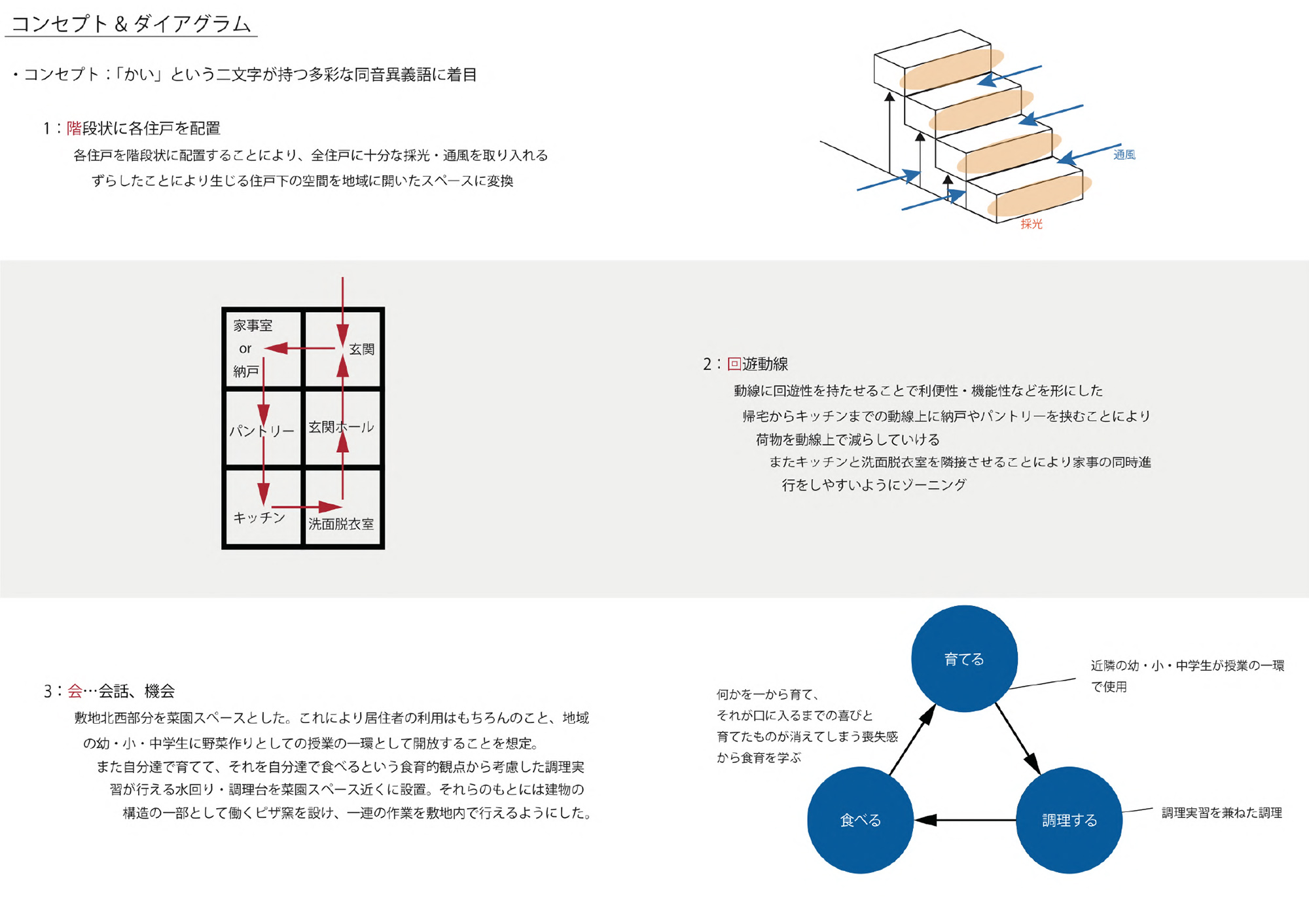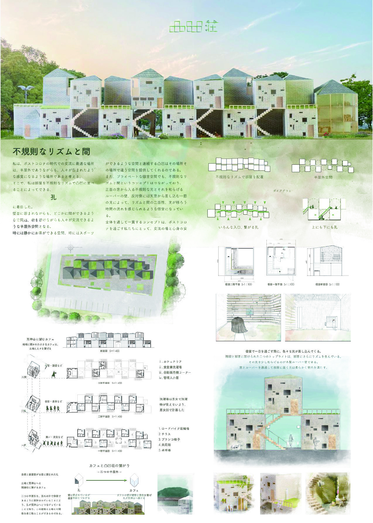 奨励賞の勝山奈央さんによる「重ね暮らしの家」は、集合住宅における交流という課題に対して、16世帯のコーポラティブハウスを通して提案するもの。私的な住戸部分、共同利用する機能、地域の人とともに使う機能を丁寧に配置することで、無理のない適度なコミュニケーションを伴った共同生活の営みを予感させる。「内から/外から双方の視点で建築を見つめ、少しずつカタチを作って」いった(らしい)住戸の集合体は、風の通り道や周辺へ配慮したボリューム形成、屋根の掛け方が検討されており、読み込むと好感が湧いてきた。こうした設計への姿勢は、今後も大切にしてほしい。