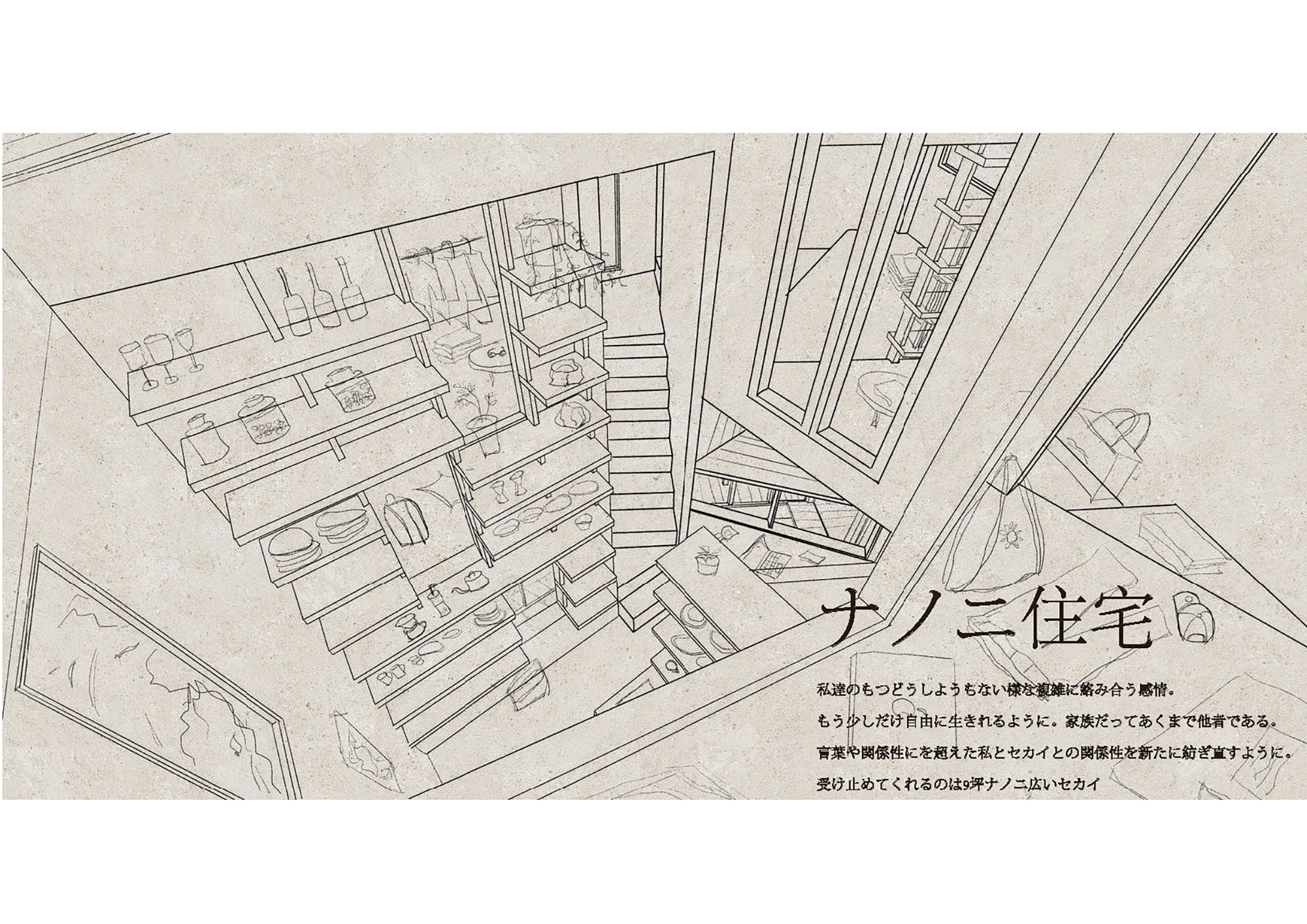 川向世瞳さんの「ナノニ住宅」は、緻密な設計により多様なスペースを包含した提案だ。9坪の住宅設計という課題に対し、驚くほど多様な生活シーンを取り込んだ住宅を実現していた。
