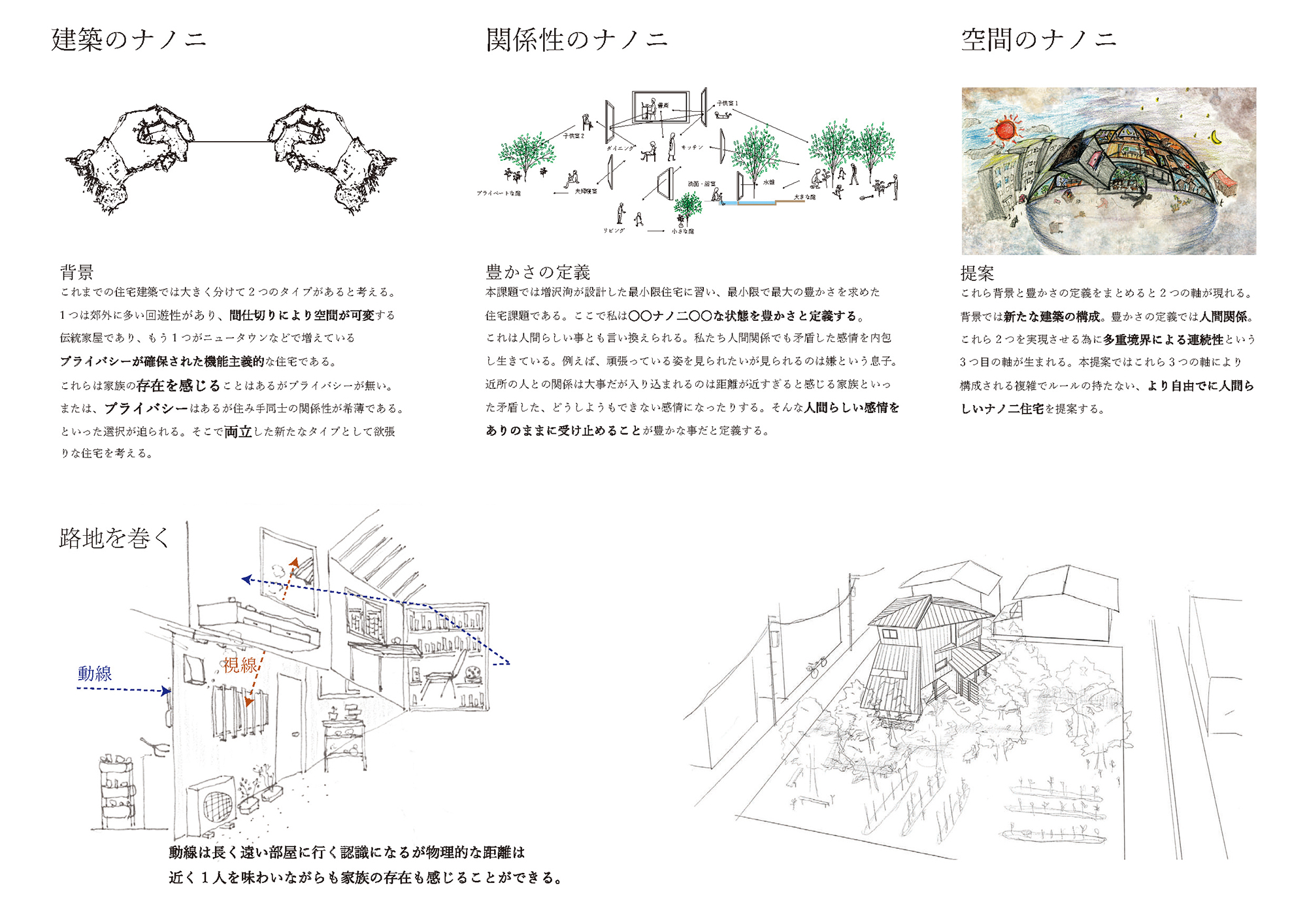 「ナノニ住宅」は、9坪を余すところなく使えていて、身体的な距離感が絶妙に描かれていました。欠点がないことが欠点と思わせるぐらい、完成度の高い作品になっていました。欲を言うとすると、屋根のかけ方を再考することで、既視感のないものにできるのではないかと思いました。