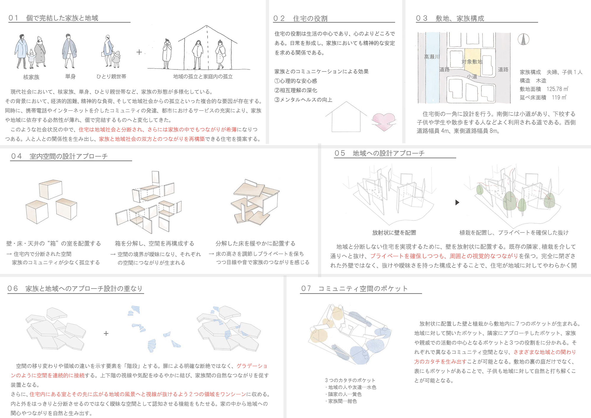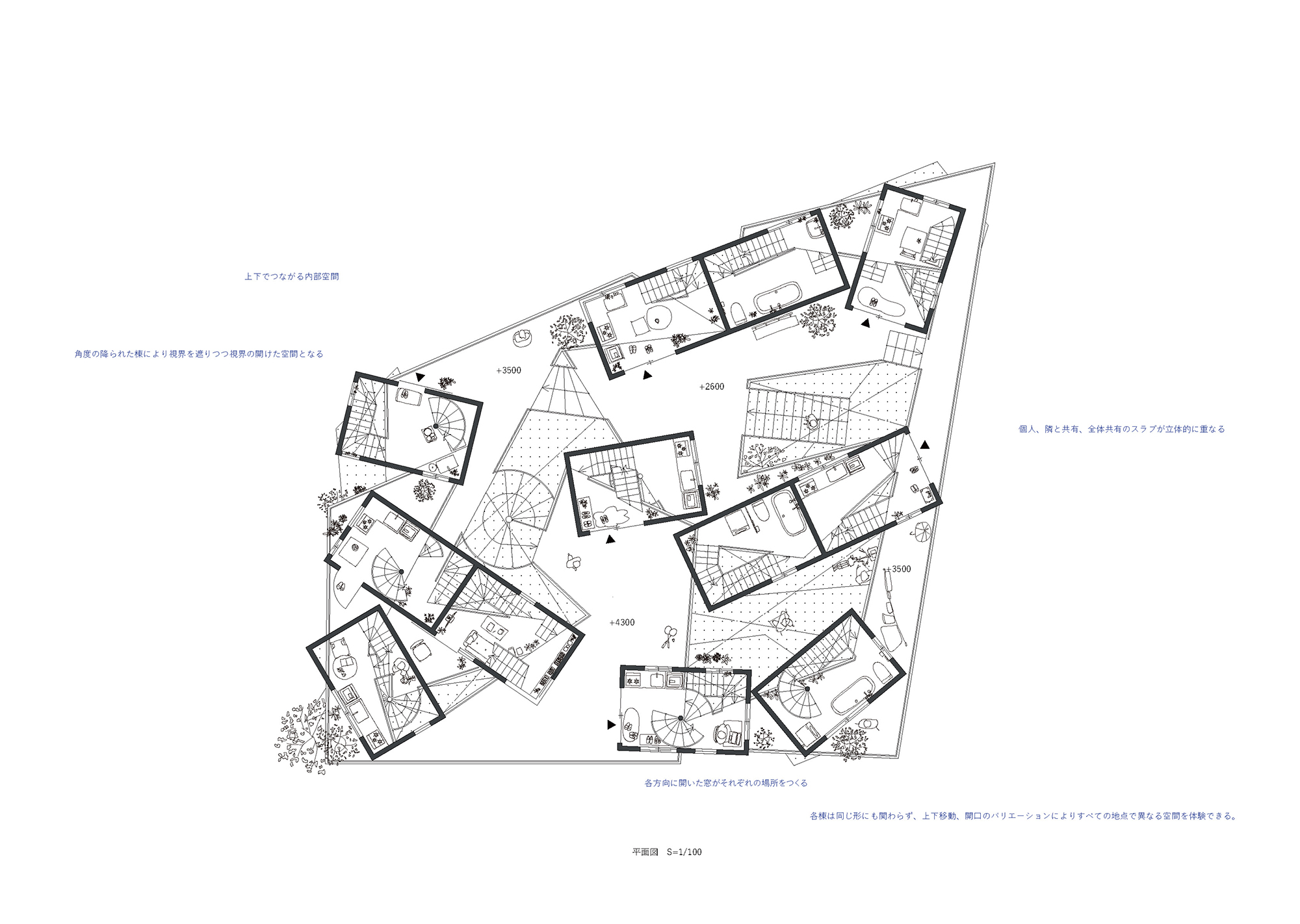 特に平出さつきさんの「暮らしと街のひととき」は、持ち込まれた大きな模型の迫力に圧倒された。僕自身もスキップフロアの住宅はよく手掛けるのだが、その経験から見ても実によく出来ている。箱を解体するような壁が物理的な囲いをつくりつつ、視線や意識が外へと抜けていく構成。そして放射状の壁と植栽が生む「7つのポケット」が、単なる隙間ではなく、地域や隣人、家族の居場所として明確に定義されている点がいい。僕にとっては馴染み深い手法だけに予想外の提案も欲しくなるが、聞けばまだ2回生とのこと。これからの成長が楽しみだ。