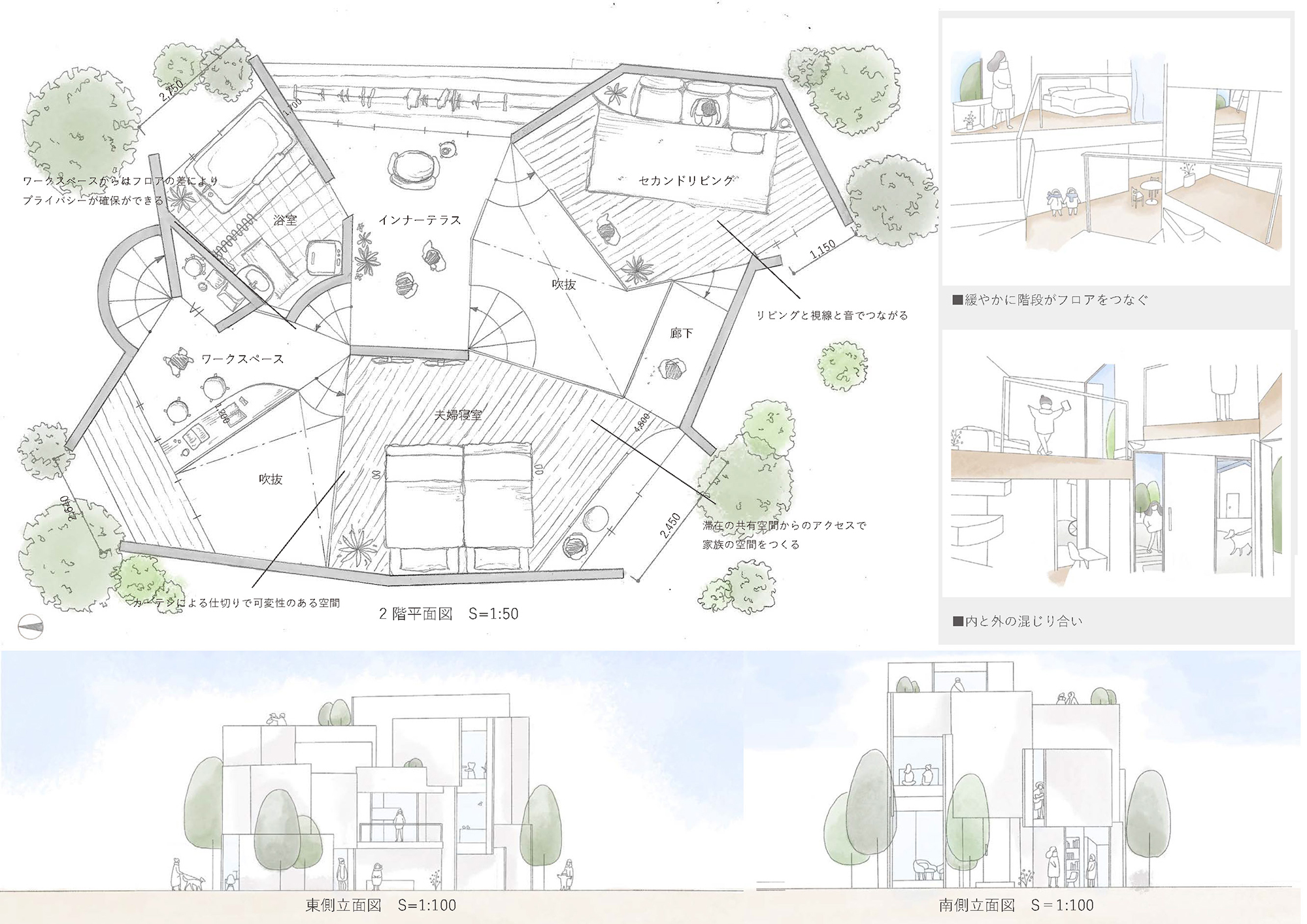 「道にすまう」は、一次審査では、内容が読み取りづらい印象でしたが、二次審査では、気づきの発端となった地域のシーンから説明されたので、よくわかりました。一次審査の資料にも、盛り込まれているとより良かったと思います。共用部の使われ方や、道としての礼儀みたいなものが、設計された建築の中でも、わかりやすく表現されていれば、もっとのめり込めたのではないかと思いました。