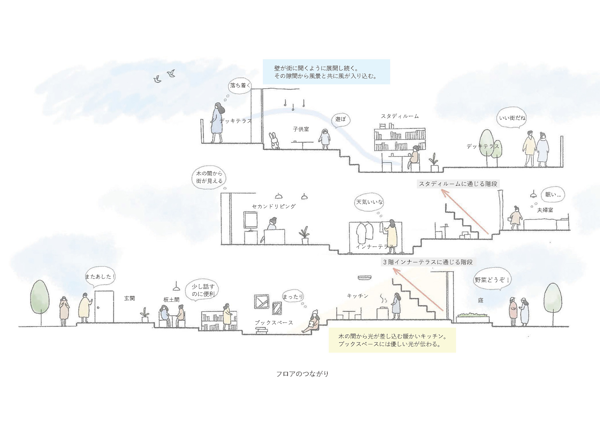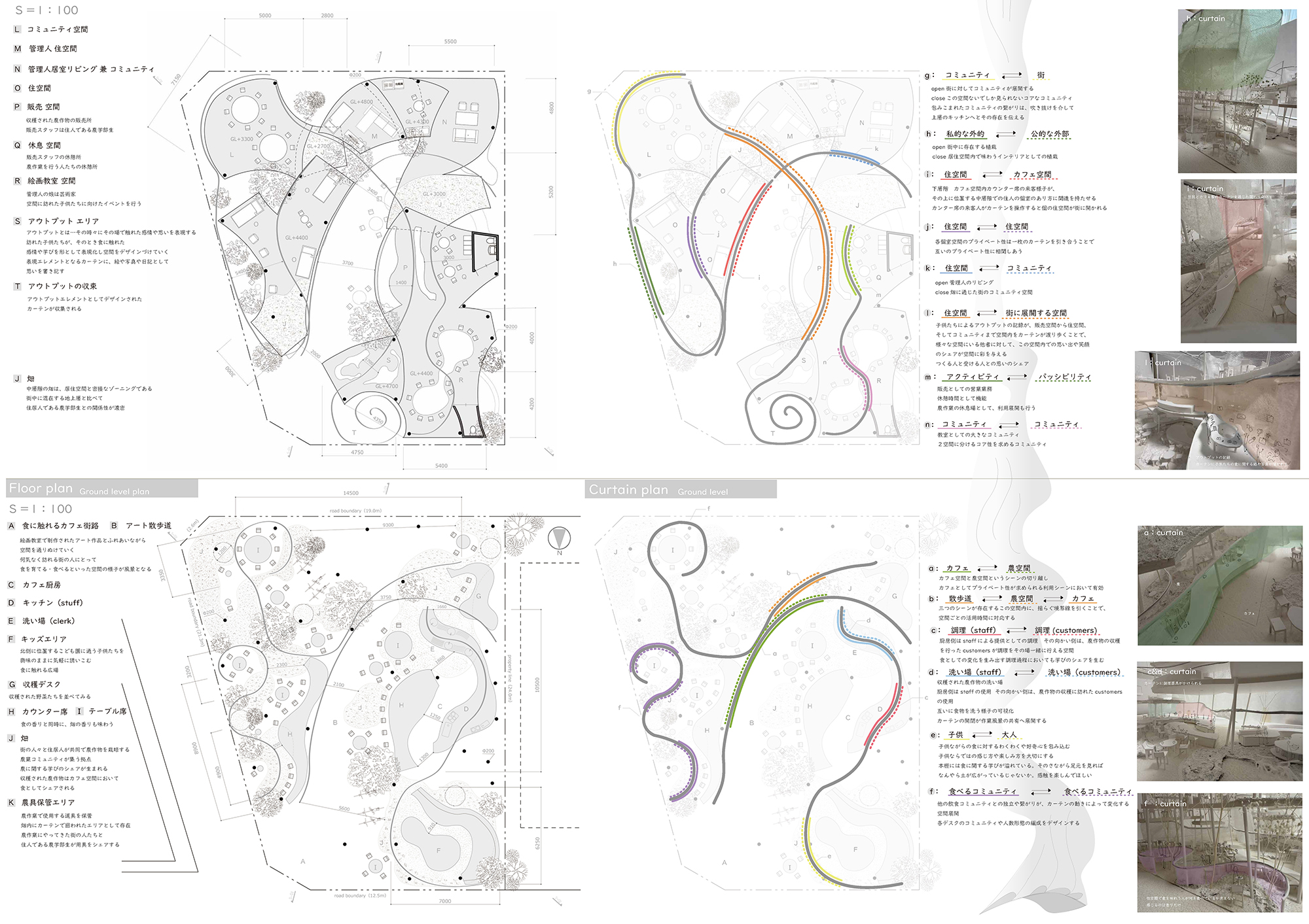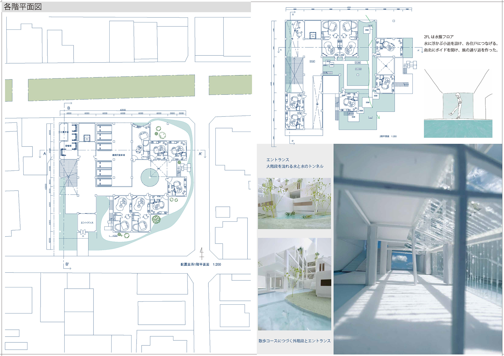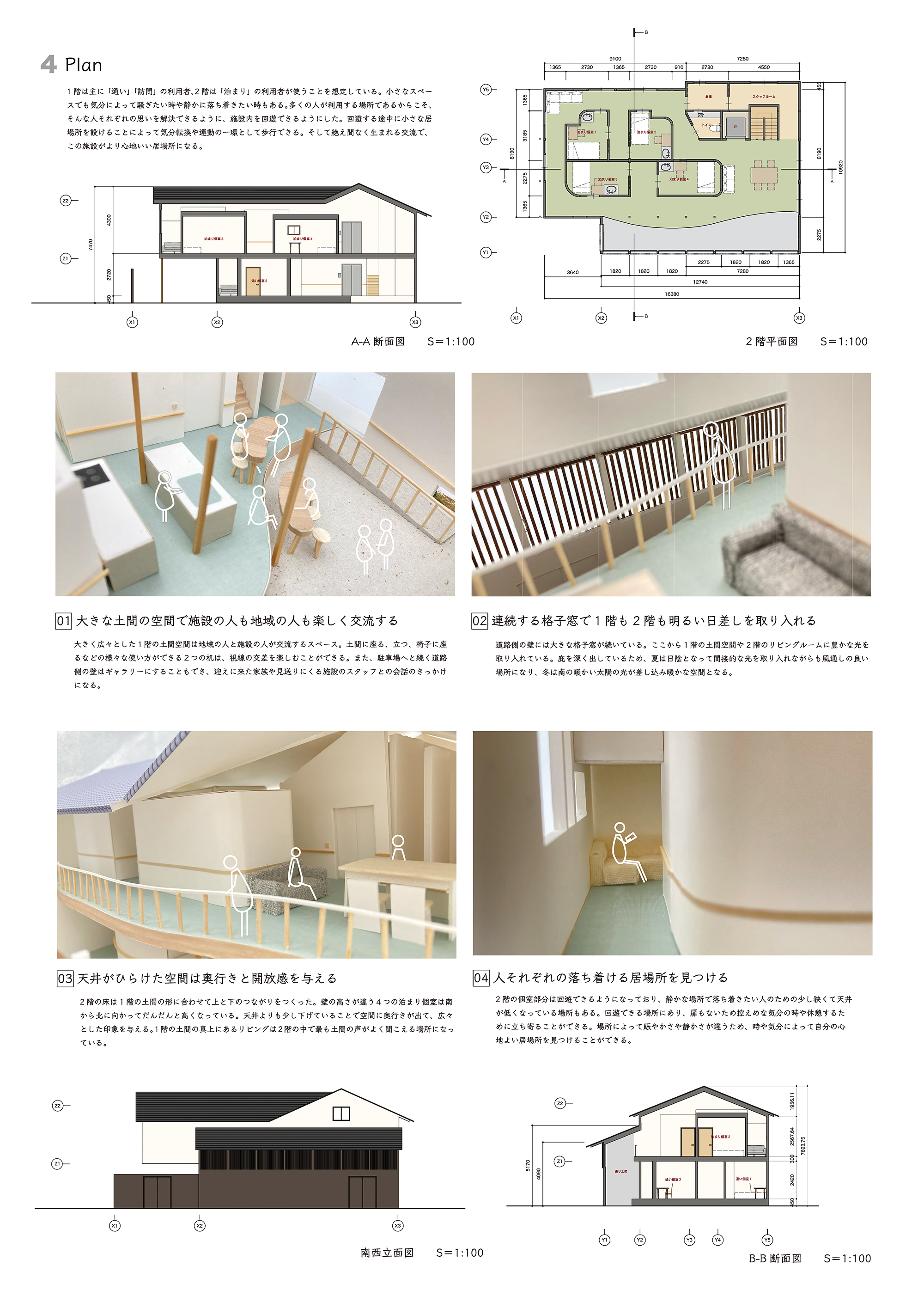 「暮らしと街のひととき」は、壁とスラブでさまざまな居場所を作りながらも、見事な回遊空間をつくり出していました。しかし、こちらも既視感が否めず、この場所にしかできない壁とスラブの並べ方や空間のつくり方、ここだからこの手法を使ったと言えるものがあるとより説得力のある作品になったと思います。
