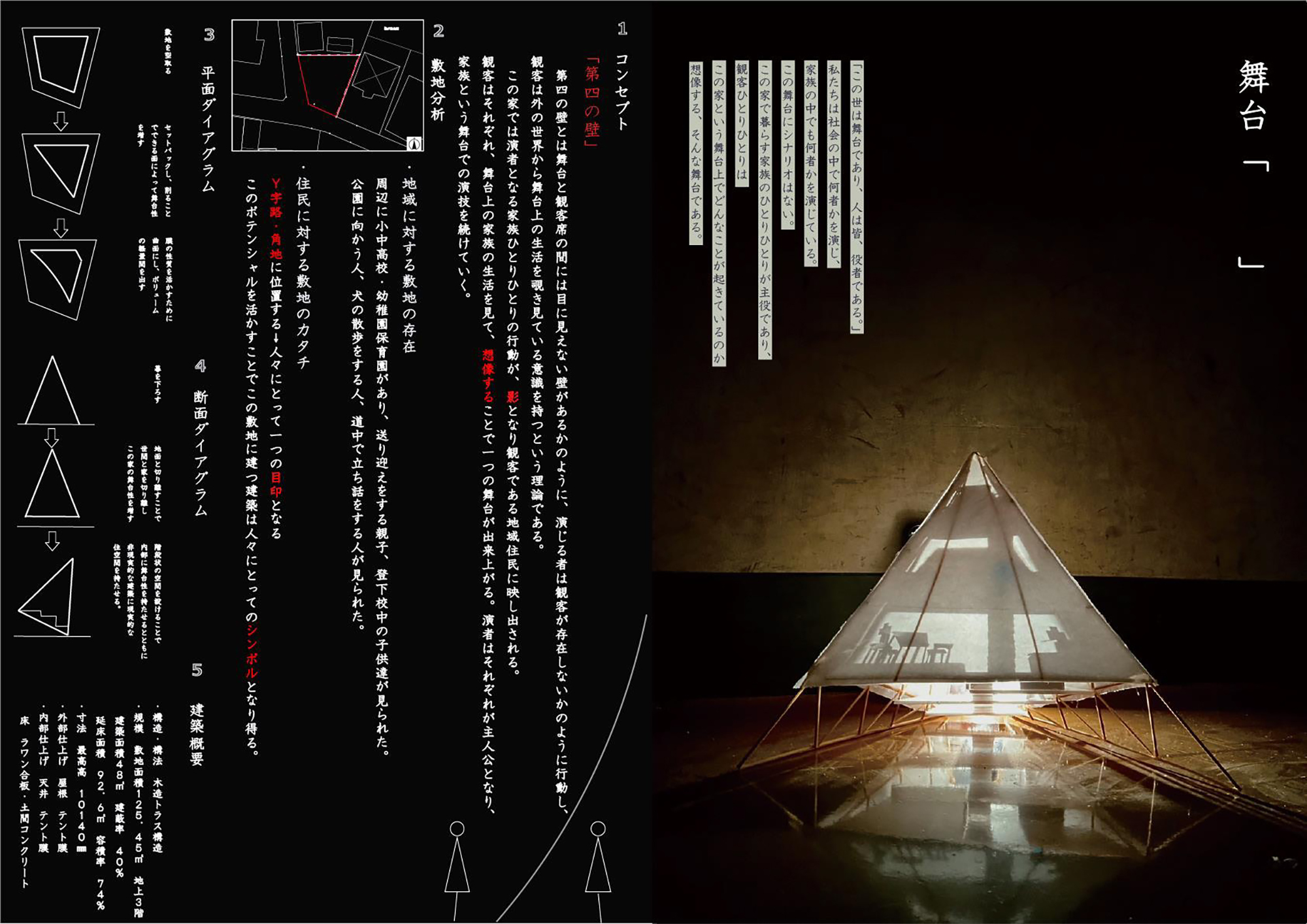 奨励賞の伊藤舞織さんの「舞台「 」」は、台形平面による四角錐の住宅で、その全体を膜で覆っている。内部の照明で浮かび上がる膜面に住民の影が映りこむ。その光景の魅力をプレゼンテーションすること一点に全力を注いでいる潔さが、他にはない力強さを感じさせた。