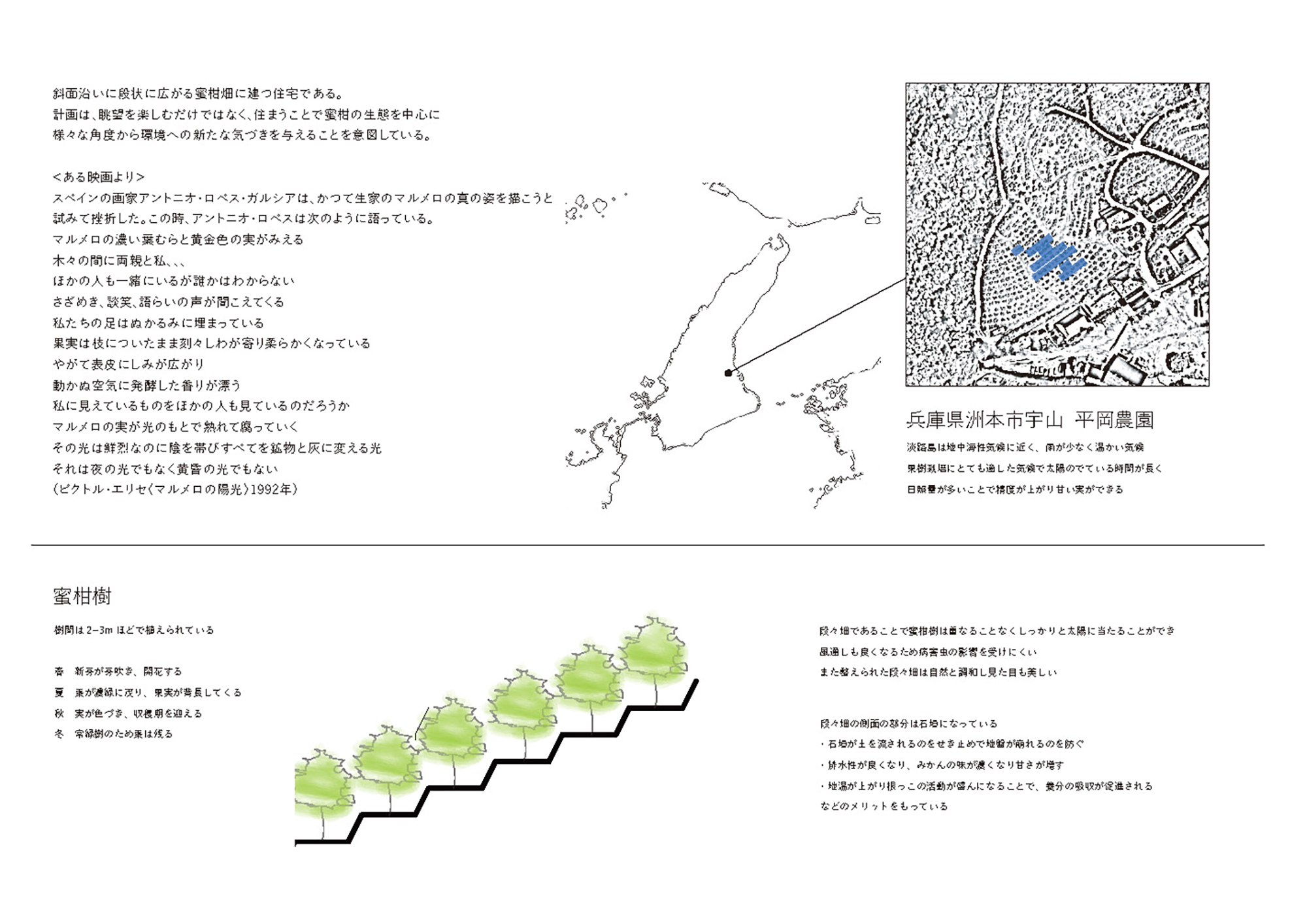 峠彩音さんの「みかん段の家」は、表現力と着想に感心した。みかん畑に横たわる住宅を俯瞰するメインパースや、スペインの画家アントニオ・ロペス・ガルシアを引用した導入、そして自由度が高い課題に対する敷地やプログラムの設定も見事だった。