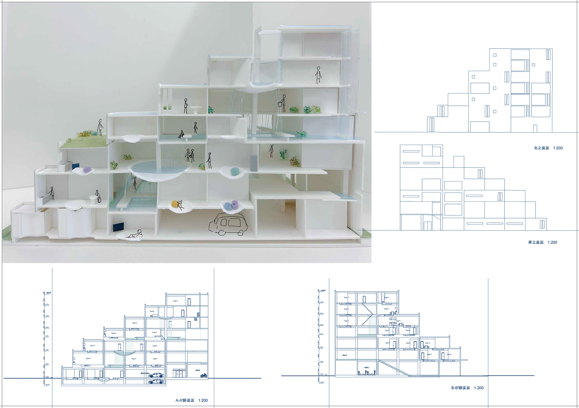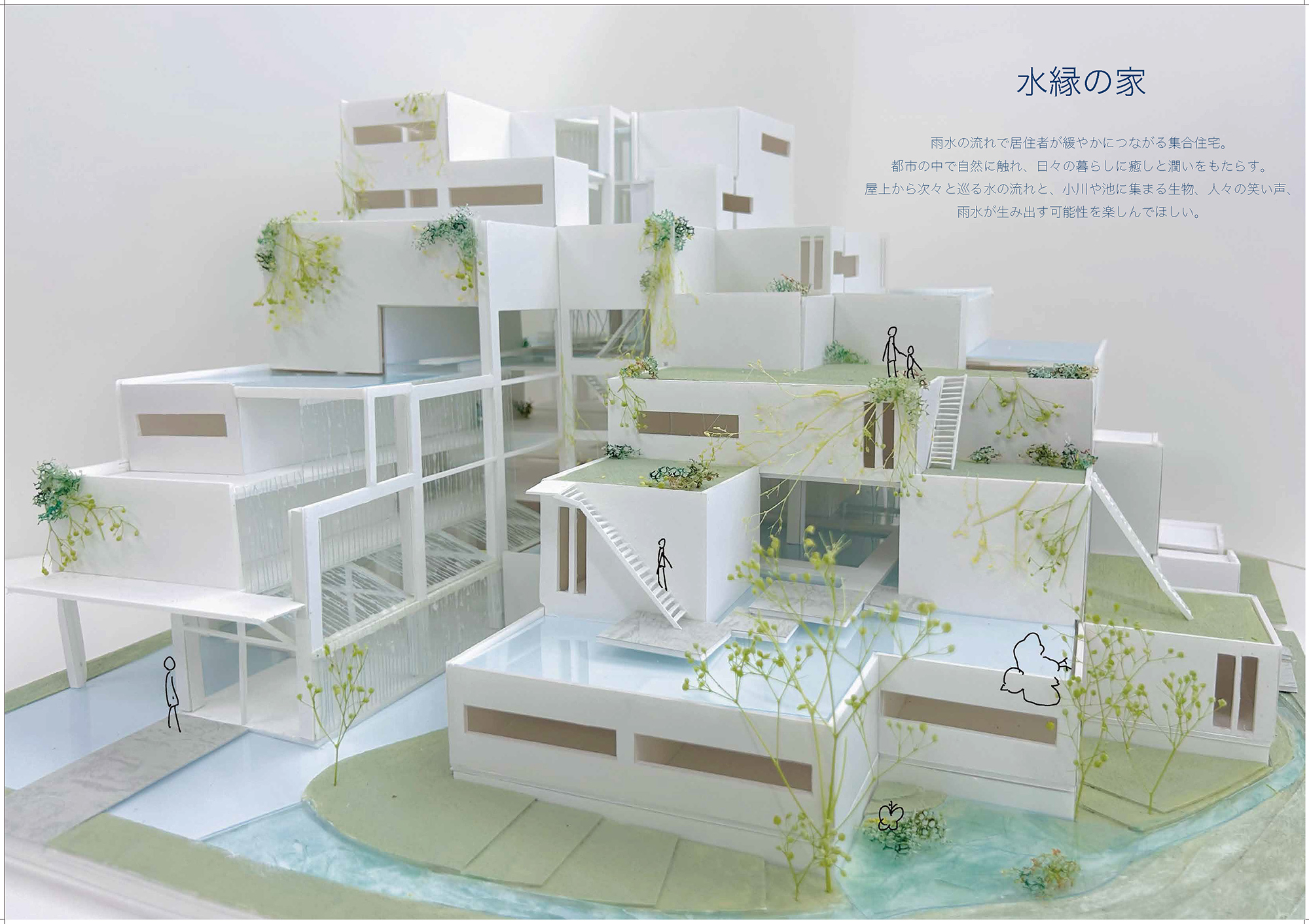 ほかにも、上空から捉えたような模型写真が美しかった峠彩音さんの「みかん段の家」、模型写真の引力が強かった小村菜々香さんの「大きくて小さな家」も心に残る。形式の可能性を信じてもっと詰めれば、さらに素晴らしい計画になっただろう。