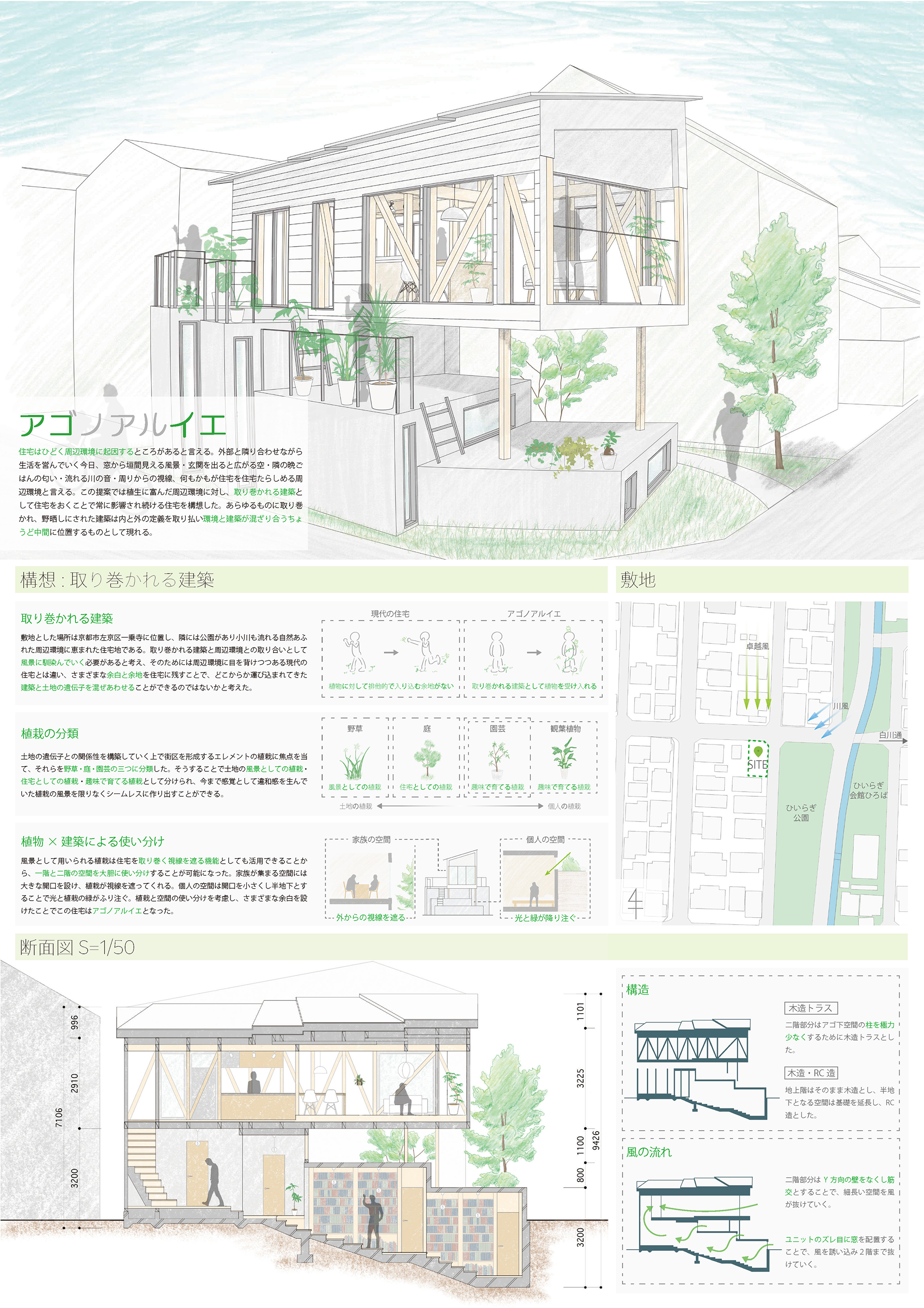 入賞作品以外では、シンプルで合理的な構成に内外の交流を促す仕掛けをさりげなく込めた大寺ちひろさんの「はみ出し、交わるくらし」、周辺の植生を丁寧に分析し詳細な設計へとまとめた竹内開偉さんの「アゴノアルイエ」も印象に残った。