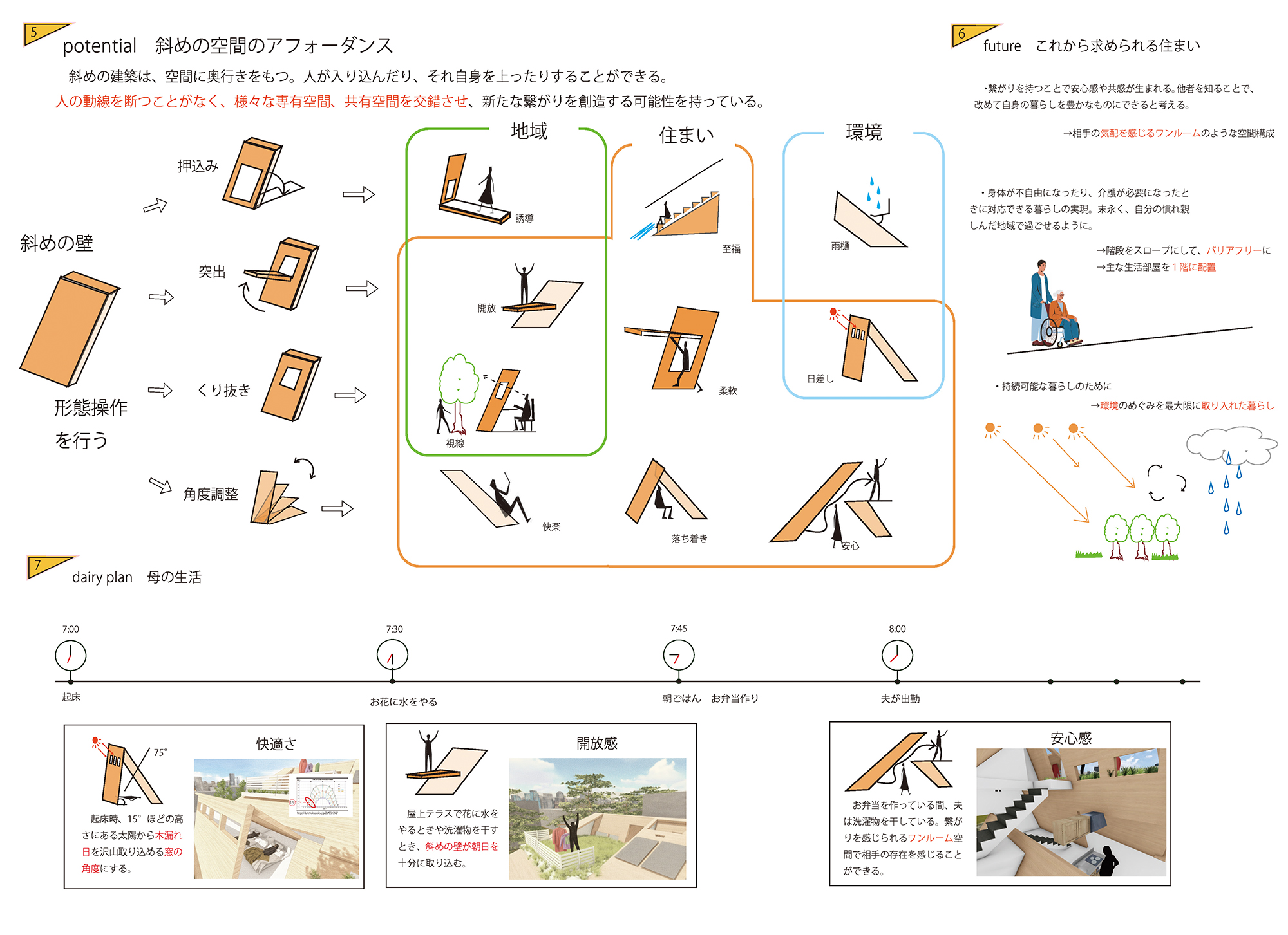 川向世瞳さんの「ナノニ住宅」も、審査の場での発見が多かった。2回生の時の課題をやり直した案とのことで、細部までよく練られていた。9坪という極小空間に設けた螺旋状の長い動線は、「物理的な移動距離は長いが、視線や気配の距離は近い」という絶妙な距離感を生んでいる。「1人を味わいながらも家族を感じる」というコンセプトが見事に空間化されていた。建具や柱、棚、床の段差で空間を柔らかく分節する手つきは、壁で仕切るのとは違う、日本的な「奥」の感覚を現代的に再解釈しているようにも感じられた。生成的な屋根の在り方が、内部での暮らしをより豊かにするものであれば、なお良かったと思う。