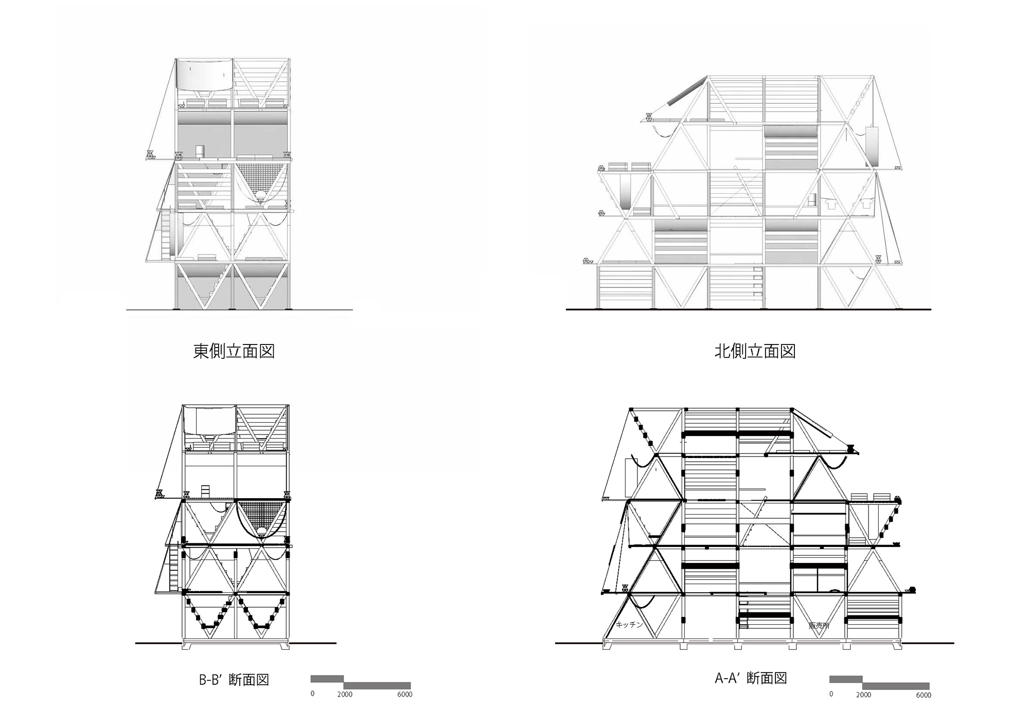 伊藤舞織さんによる「舞台「 」」は、住宅を舞台に読み替え、その役割やプライバシーを揺るがす提案だ。透過素材で覆われ、シルエット状に生活がにじみ出る。第一印象ではアートプロジェクトを思わせる軽やかな仮設性が際立つが、軸組は力強く美しい。そしてその姿は、私生活がビッグデータに絡め取られ日常が丸裸にされる現代人を映し出すオブジェとしても解釈可能な、奥行きある提案だった。